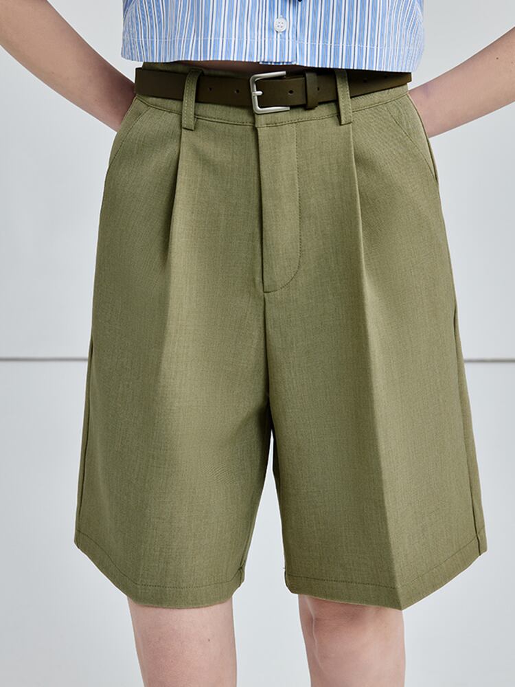 [EWQ] グリーンストレートワイドレッグショーツ夏潮プリーツウエストルーズハーフスーツパンツ 16Y9493 サマー 夏物 ブルマー ワイドパンツ