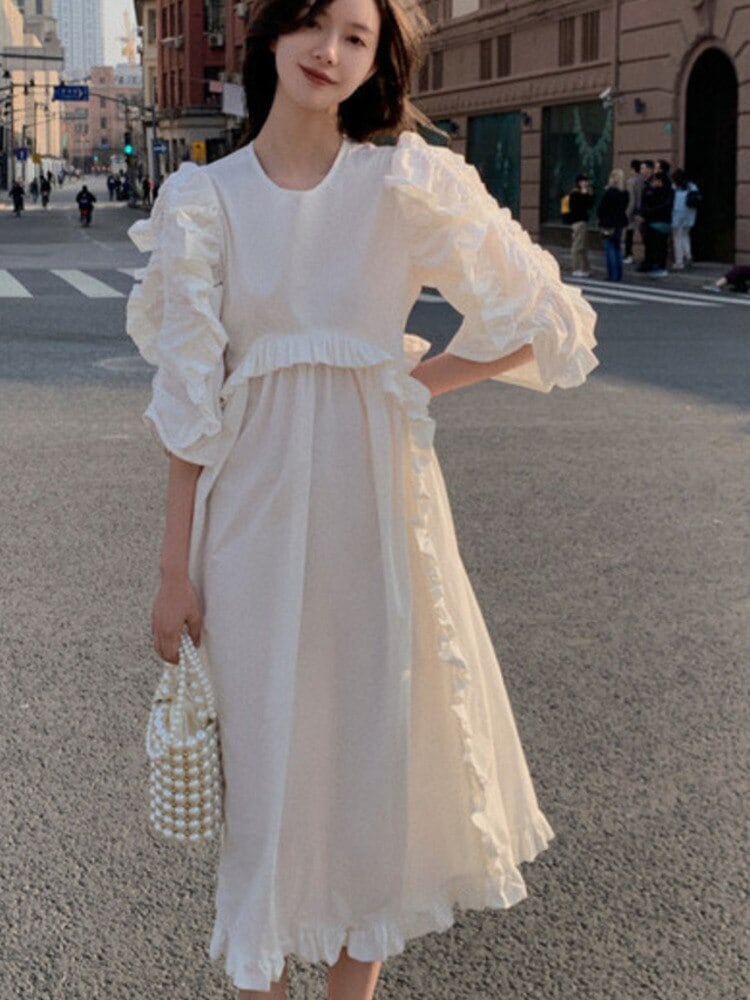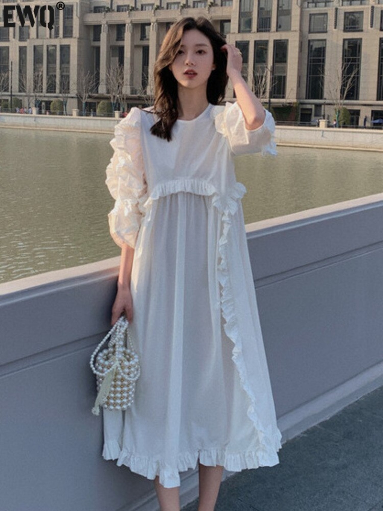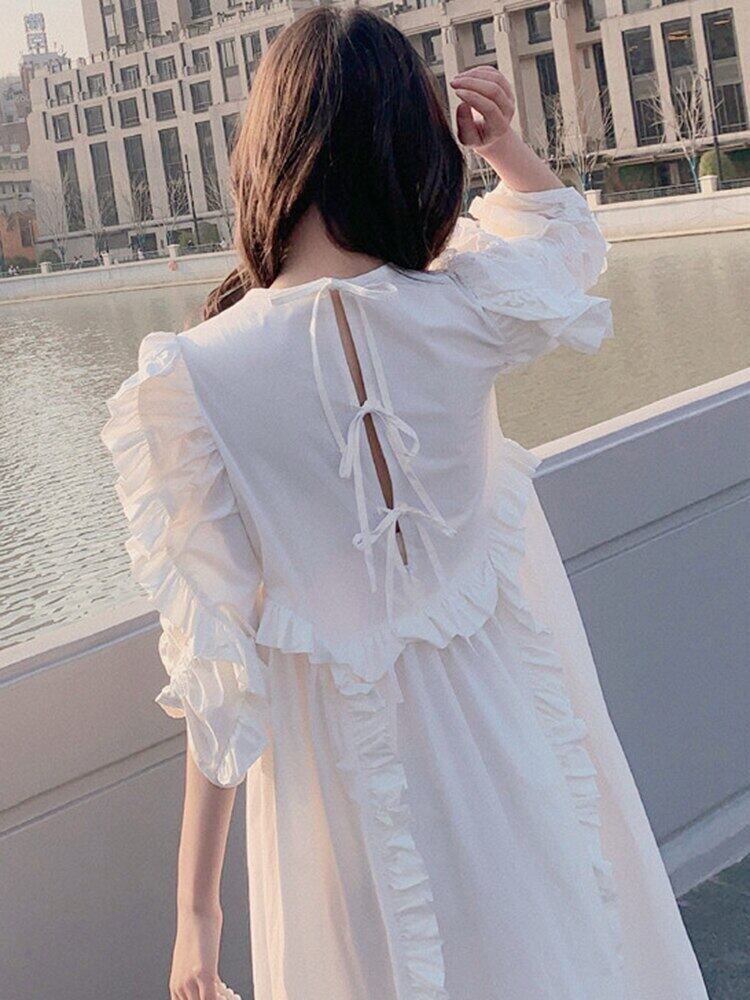 [EWQ] フリル パッチワーク ホワイト ドレス パフ スリーブ バック レースアップ ルーズ O ネック ドレス 夏潮 Vestidos サマー 夏物 Oネック