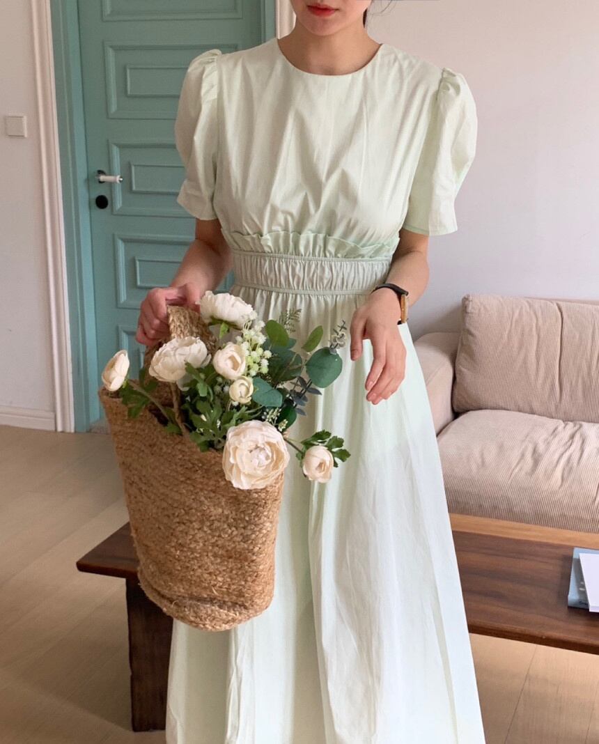 [EWQ] 甘い気質ドレスプリーツウエスト弾性 O ネックドレス夏潮半袖 Vestido ショート ハーフスリーブ エラスティック 伸縮 大人ガーリー スウィート キュート カジュアル サマー 夏物 Oネック