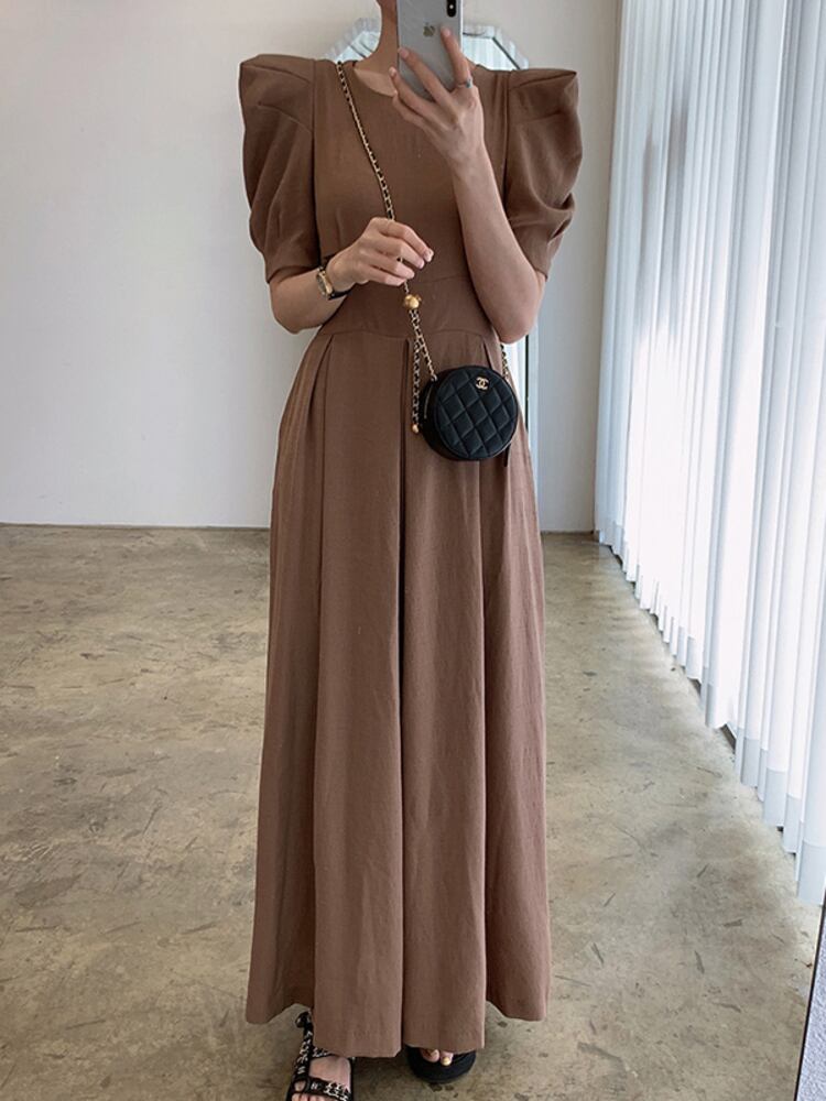 [EWQ] バブルスリーブワイドレッグジャンプスーツパンツ O ネックプリーツウエストソリッドカジュアルジャンプスーツ夏潮 Y9311 サマー 夏物 Oネック ワイドパンツ ソリッドカラー