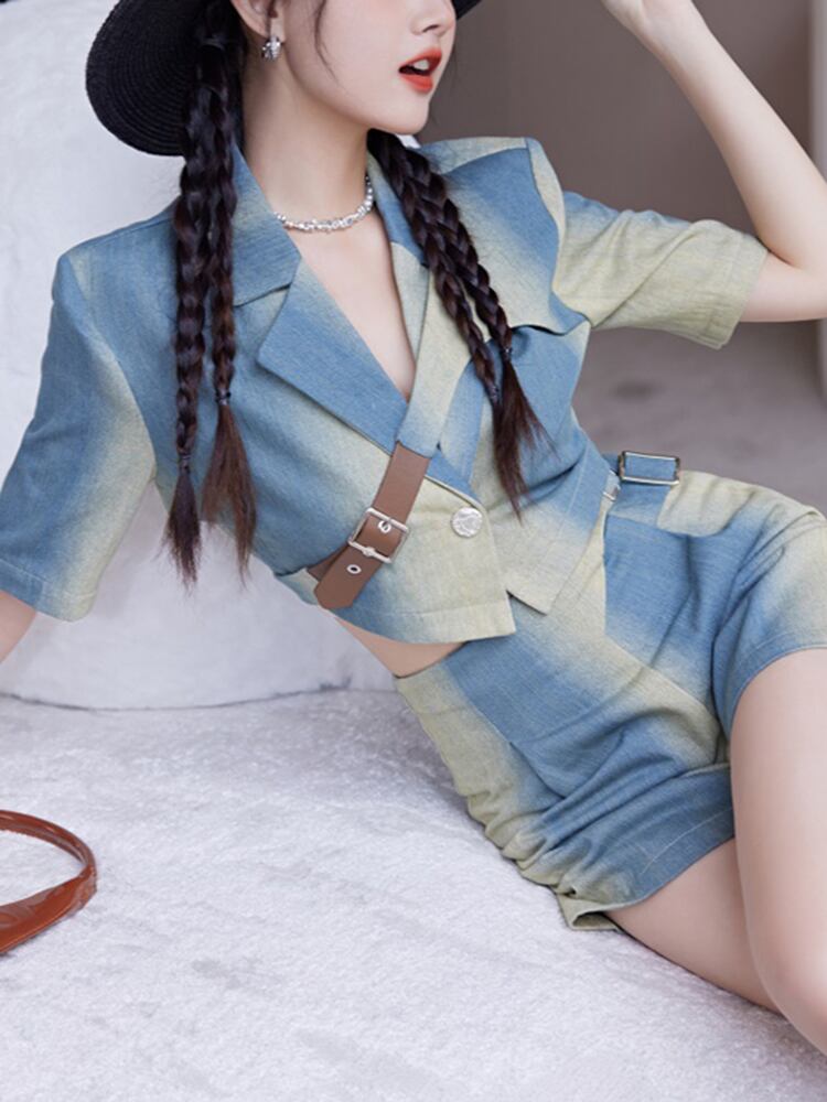 [EWQ] スーツ 1 ボタン デニム シャツ ウエスト ワイドレッグ ショーツ プリント コントラスト カラー サマー タイド セット 9473 夏物 ブルマー ワイドパンツ