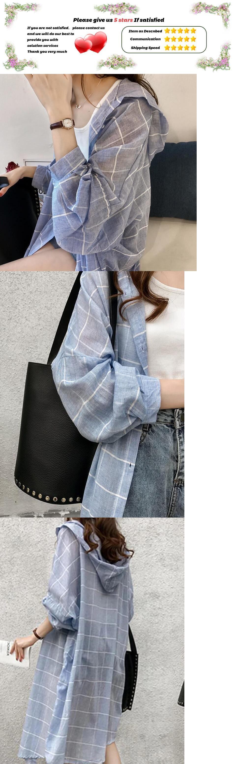 [EWQ] ブルーチェック柄コントラストロングシャツランタンスリーブルーズフィットフード付き潮夏服トップ 6U399 サマー 夏物