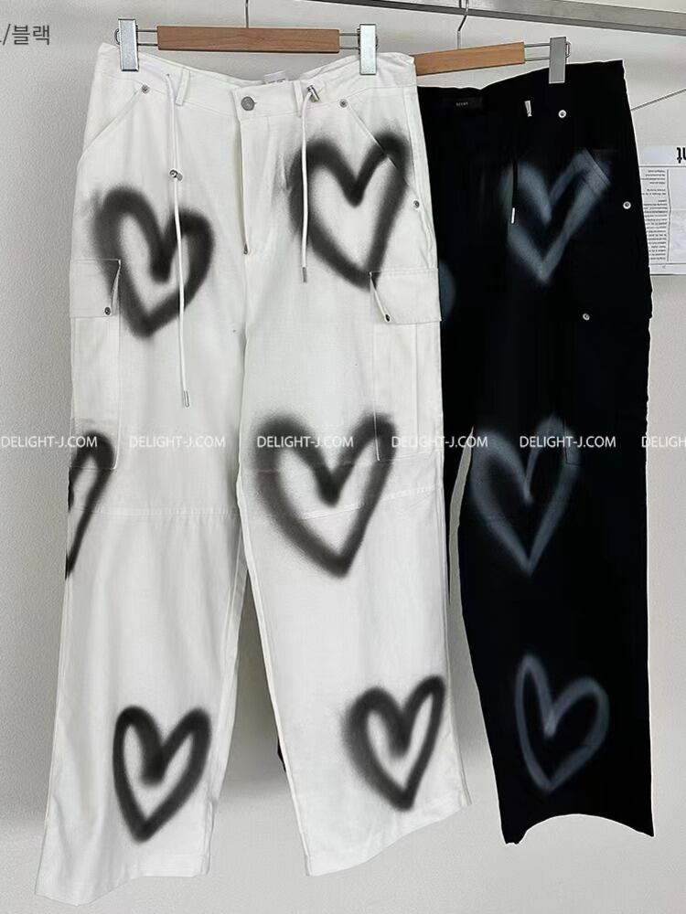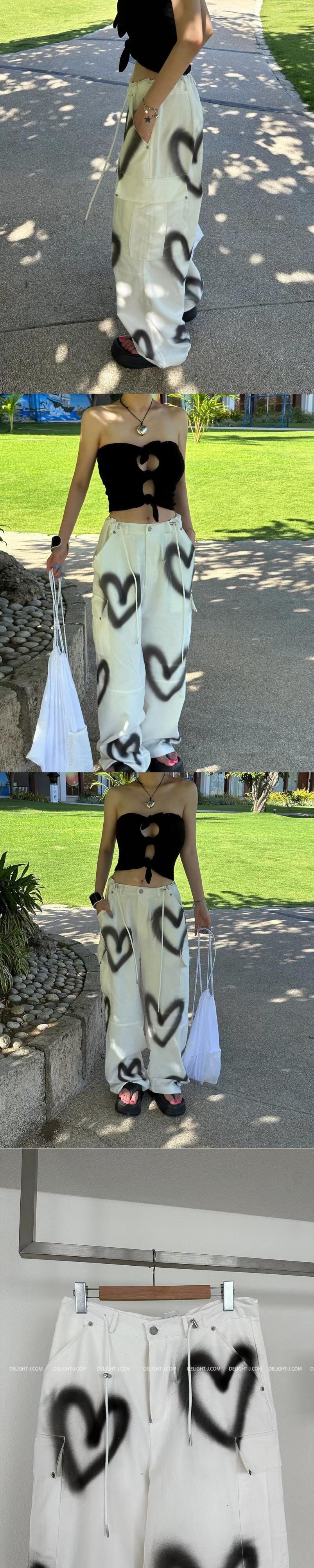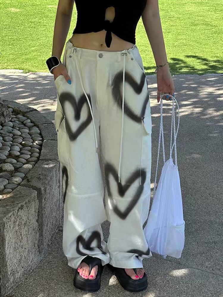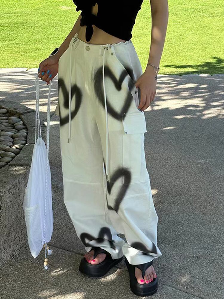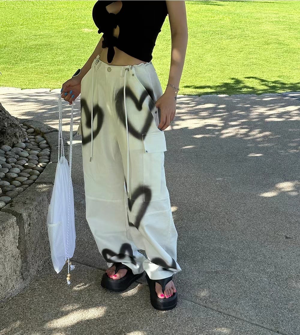 [EWQ] ラブグラフィティ巾着タイアップワイドレッグパンツコントラストウエストストリートパンツ夏潮 サマー 夏物 ワイドパンツ