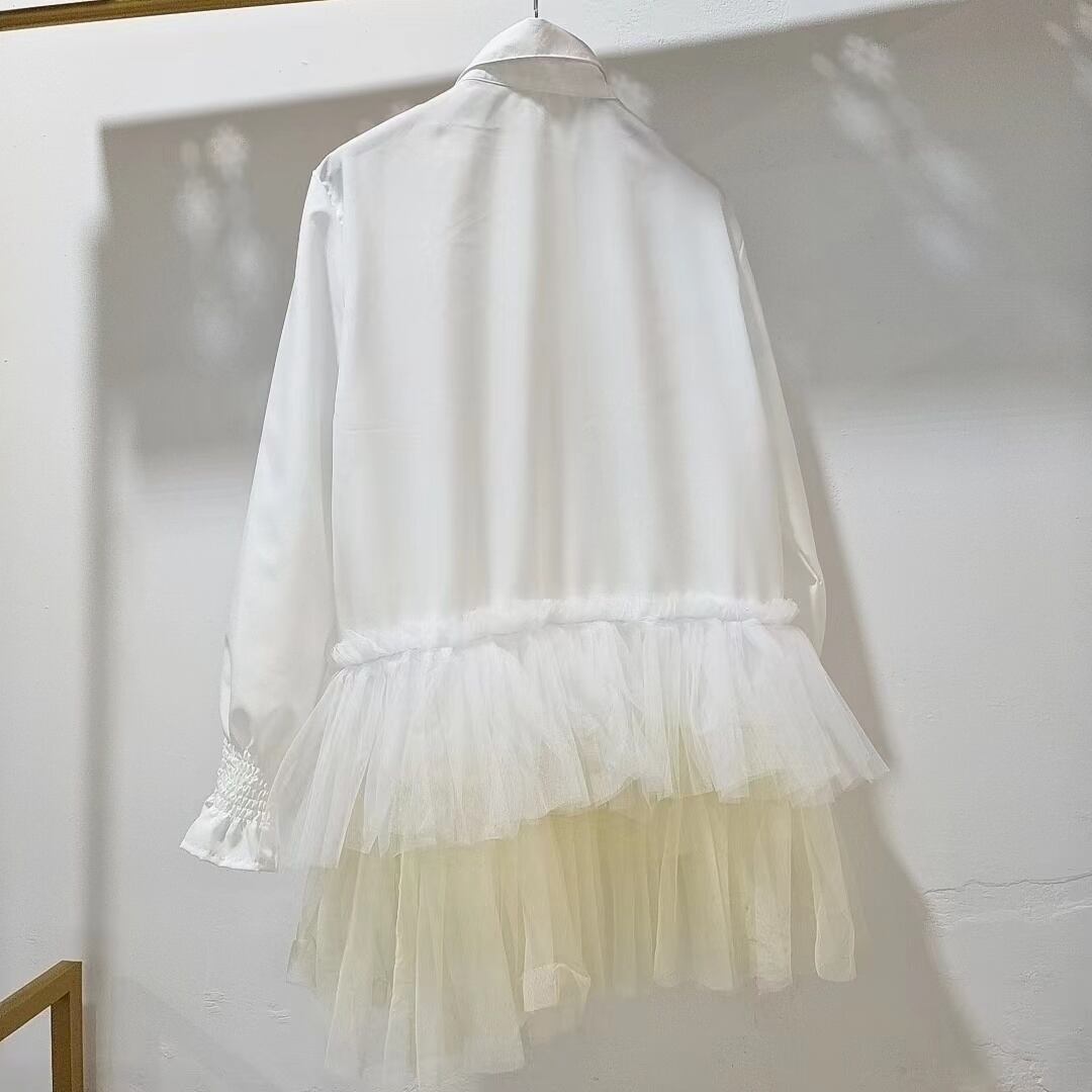 [EWQ] 3D メッシュパッチワークホワイトシャツドレスランタンスリーブ裾ガーゼスプライシングコントラストドレス春夏 Vestido スプリング 春物 サマー 夏物