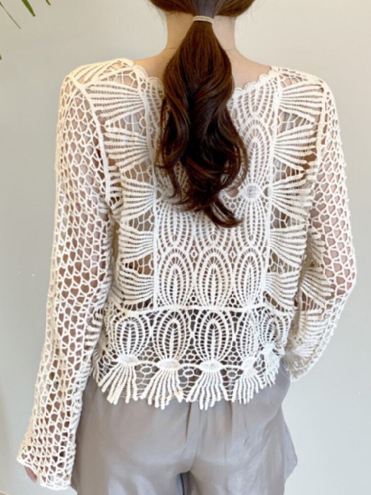 [EWQ] セクシーニット薄い夏服フック花中空長袖シャツ潮気質トップ ロング サマー 夏物 フラワーデザイン