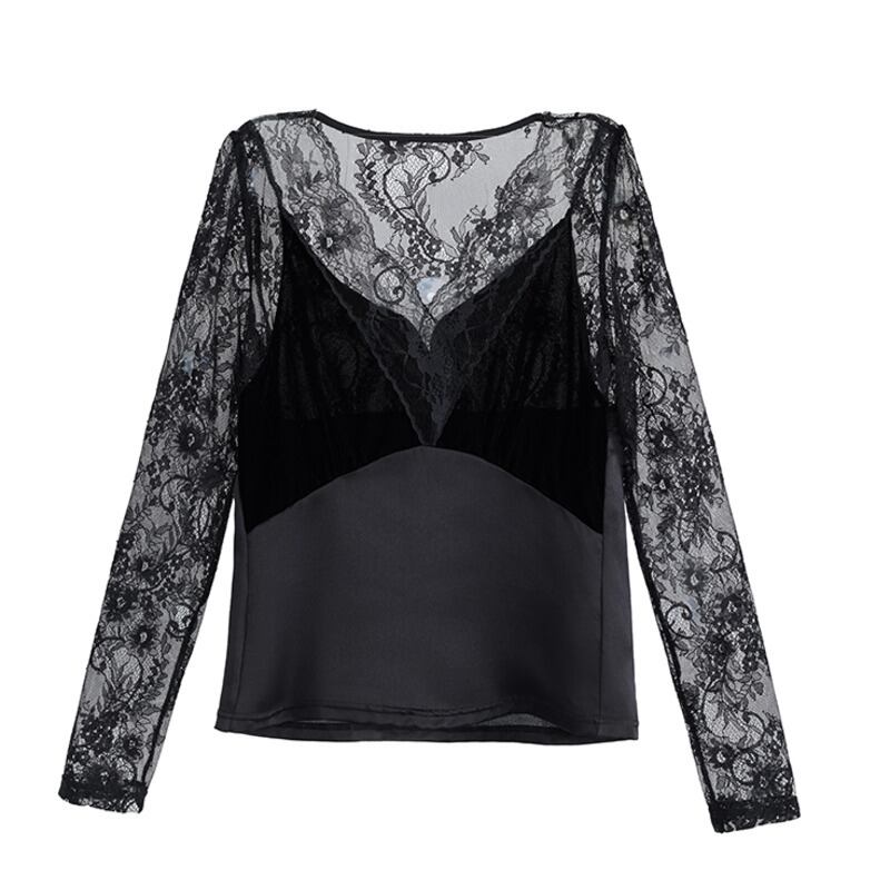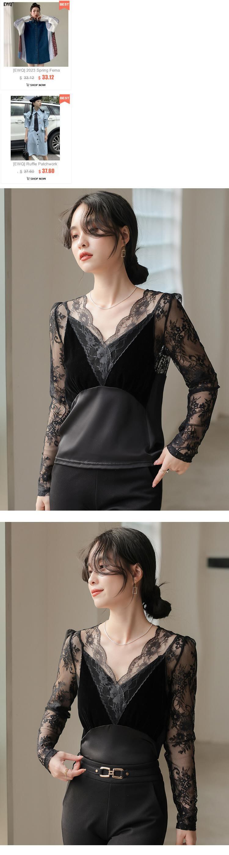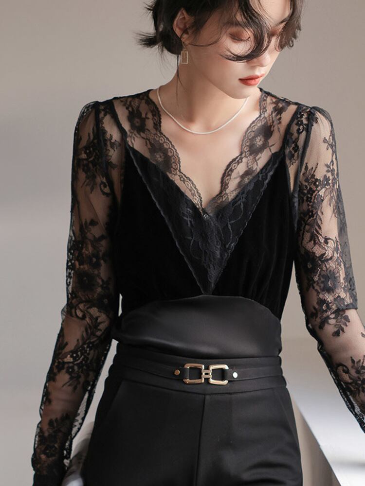 [EWQ] セクシーレース長袖透視 V ネックフックフラワースリムシャツ夏潮気質トップ ロング サマー 夏物 Vネック フラワーデザイン