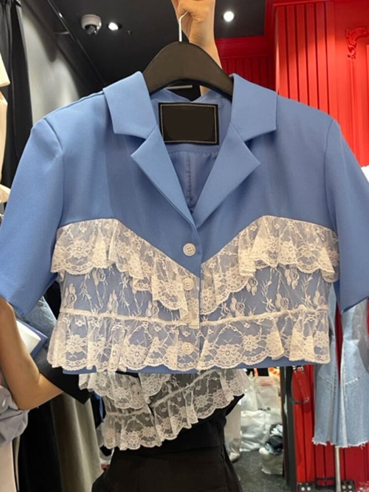 [EWQ] レースパッチワークショートブレザーコート 202 夏潮薄いシングルブレストコントラストカラースーツジャケットトップ 6U21 サマー 夏物