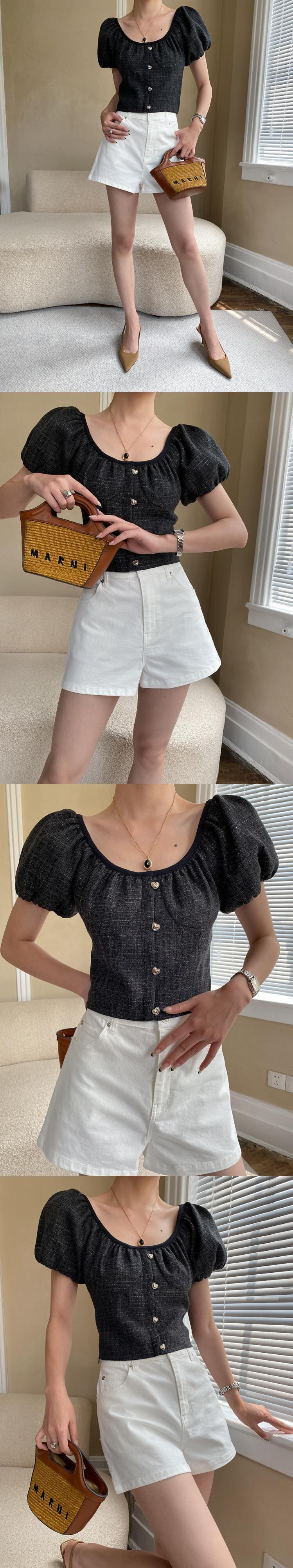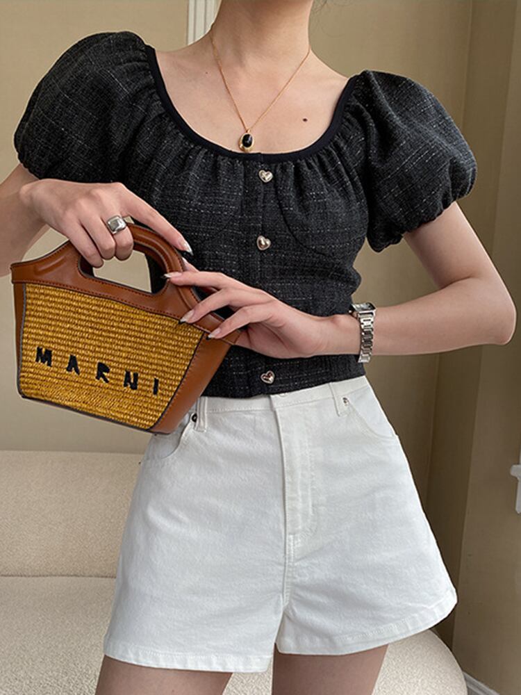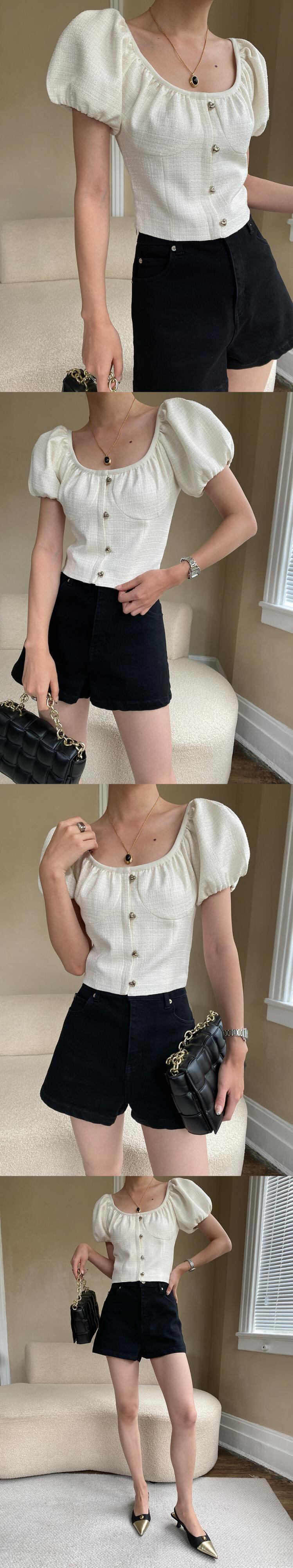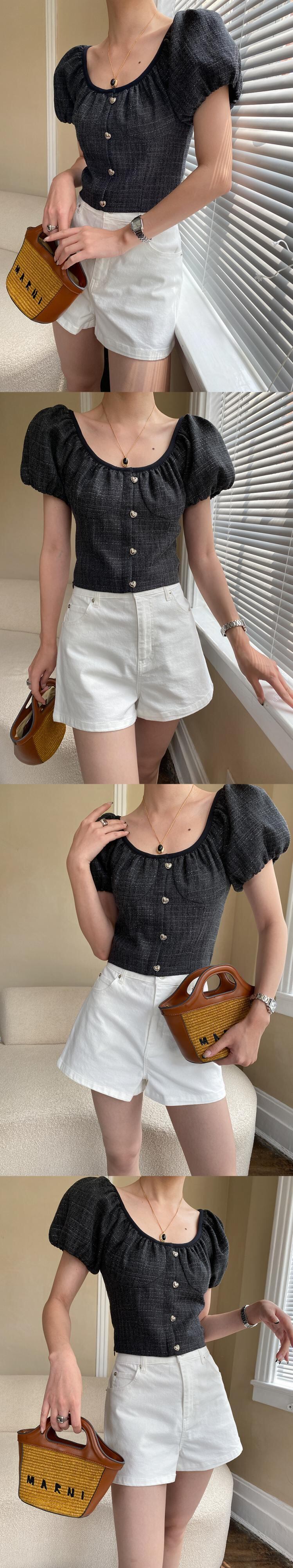 [EWQ] スクエアネックツイード Tシャツボタン装飾パフスリーブレディース Tシャツトップ夏潮 Tシャツ サマー 夏物 スクウェア
