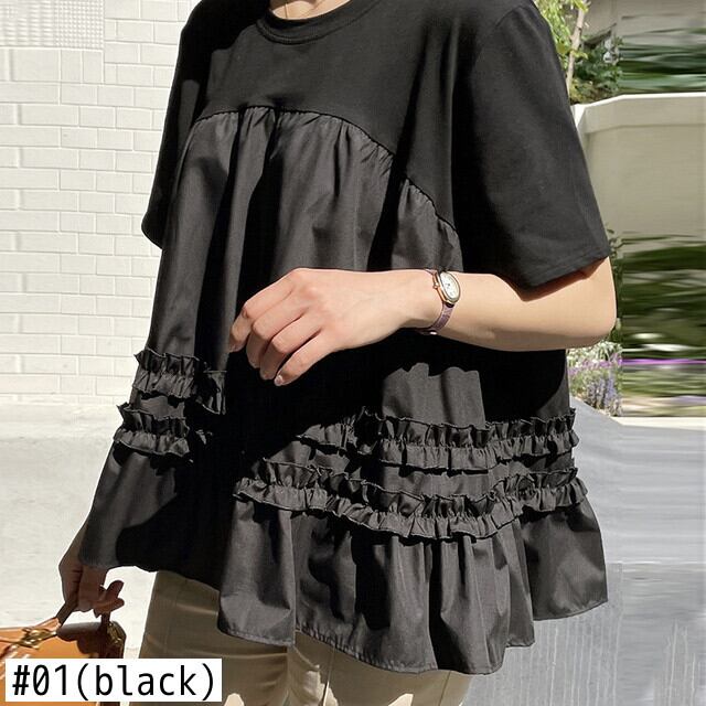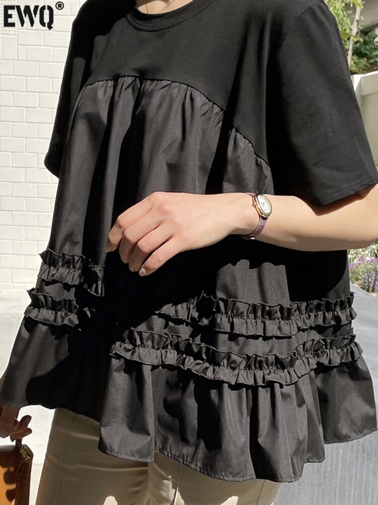 [EWQ] レディース パッチワーク フリル スプライス シャツ ブラック プリーツ スプライス ルーズ フィット 半袖 サマー タイド トップ ショート ハーフスリーブ 夏物