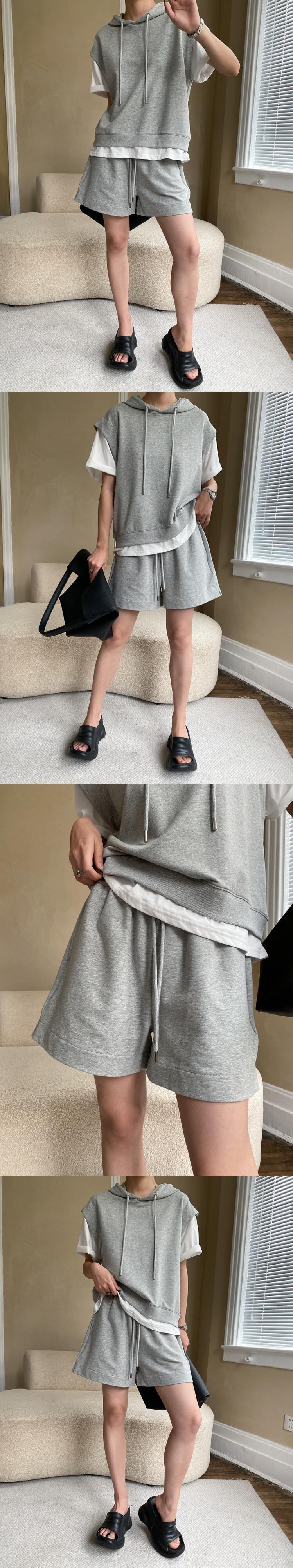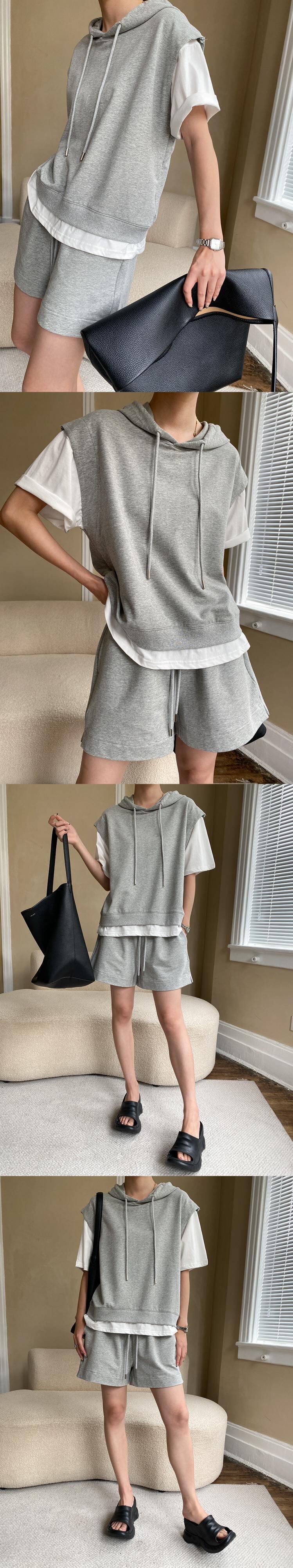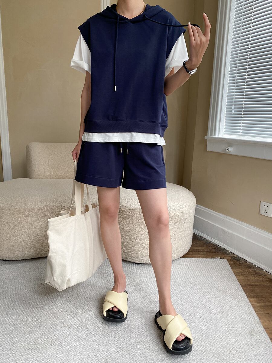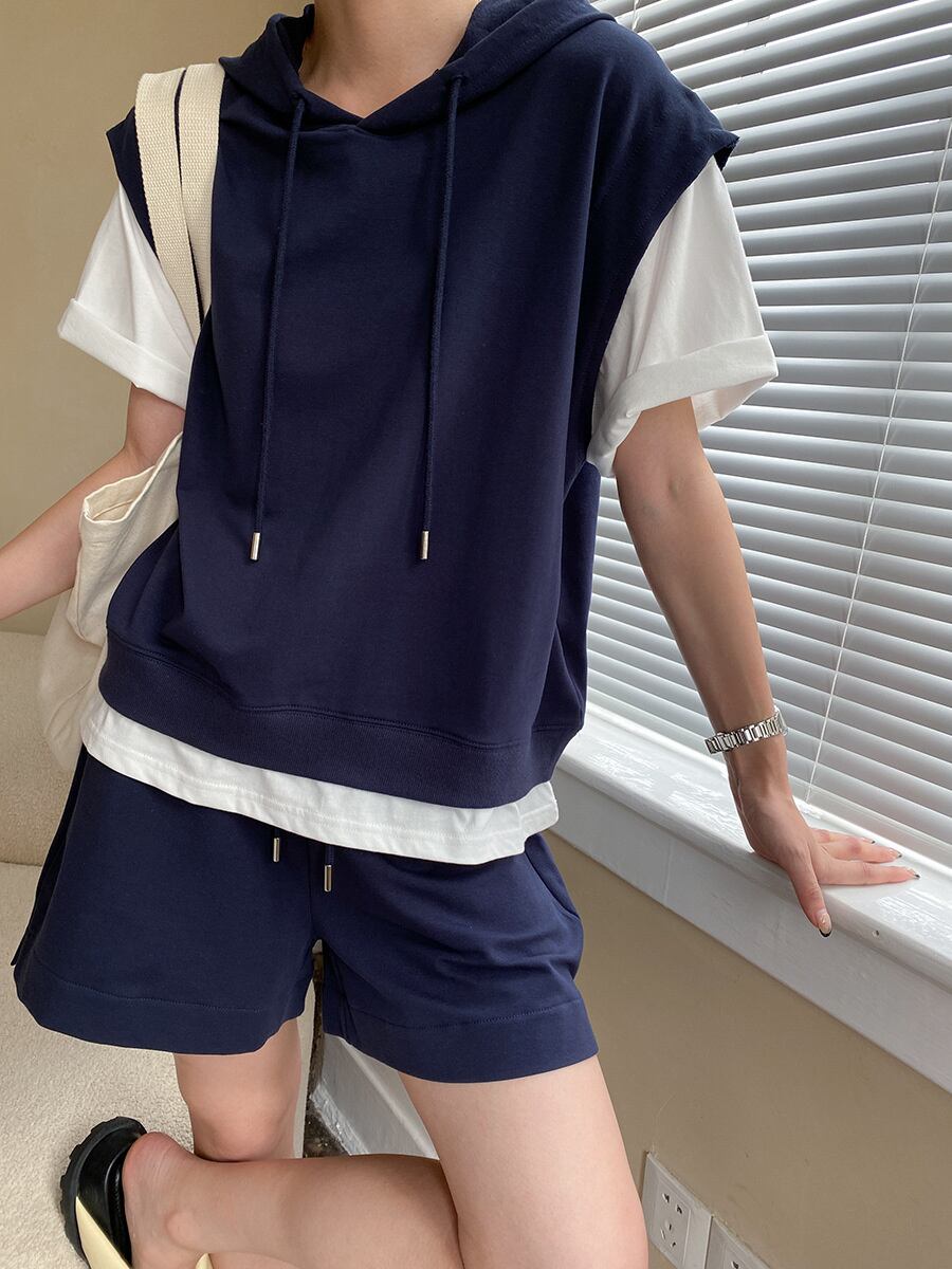[EWQ] フード付きレースアップフェイクツーピース Tシャツ + ウエスト弾性ルーズショーツ夏潮ツーピーススーツ エラスティック 伸縮 サマー 夏物 ブルマー