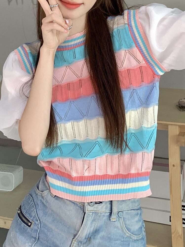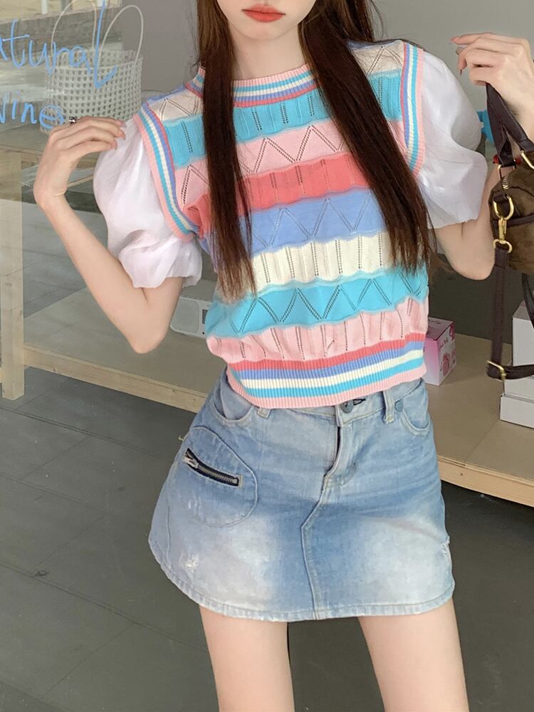 [EWQ] フェイクツーピースニットTシャツ コントラストストライプ パッチワーク パフスリーブ ショートトップス サマータイドTシャツ 16U780 夏物