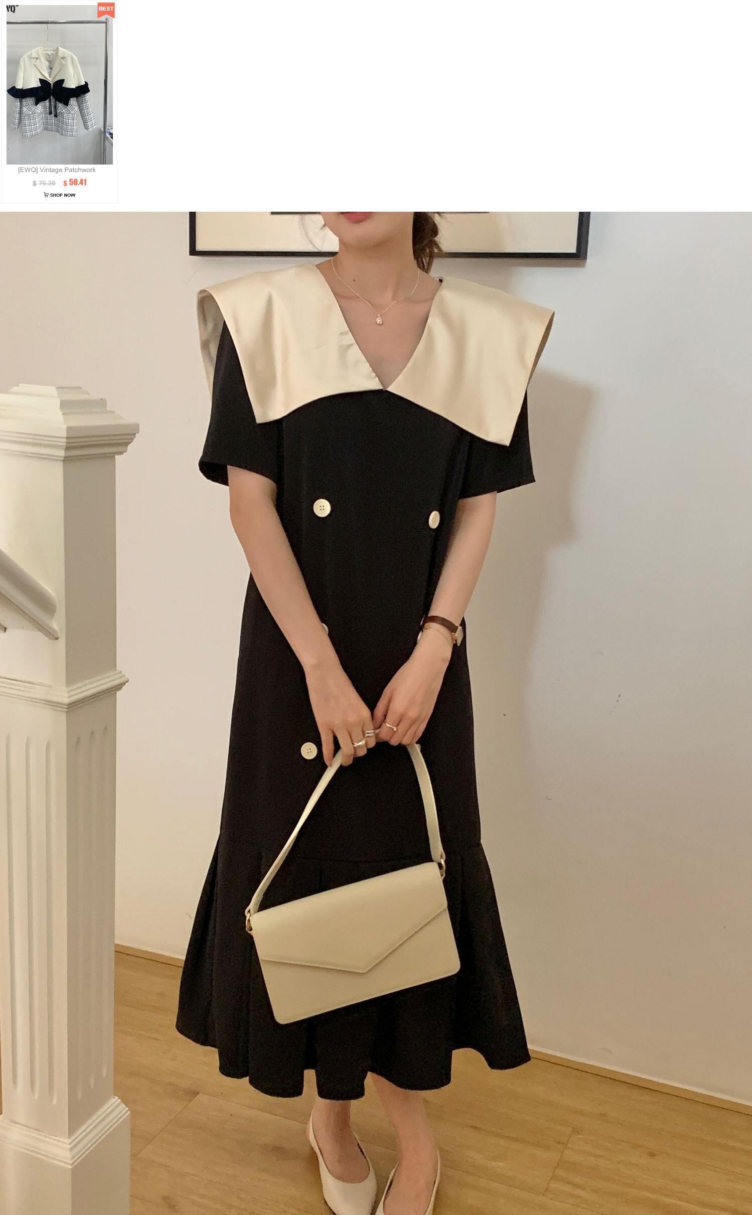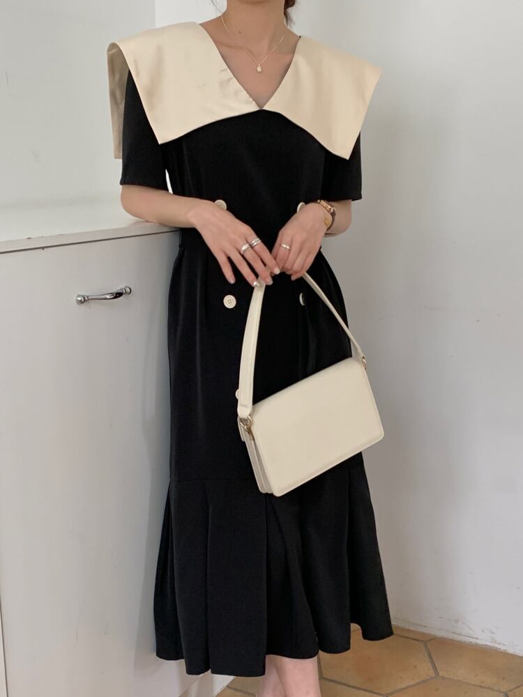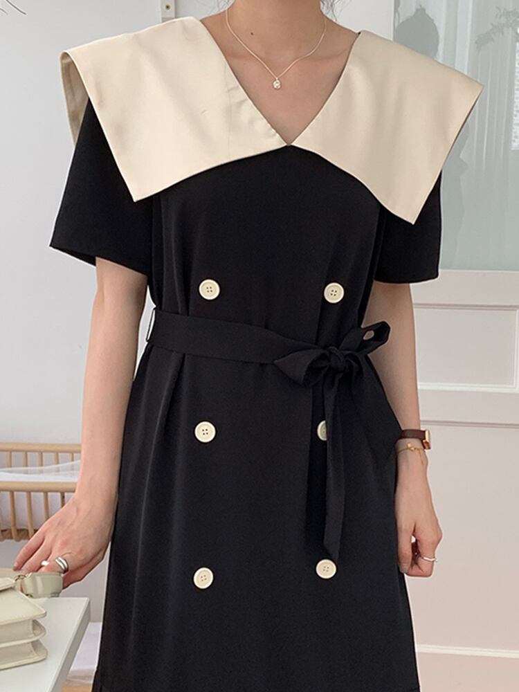 [EWQ] トランペットドレスコントラストカラーラペルダブルブレストレースアップサマータイドブラック Vestido ドレス 夏物