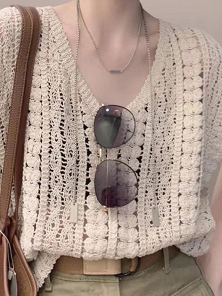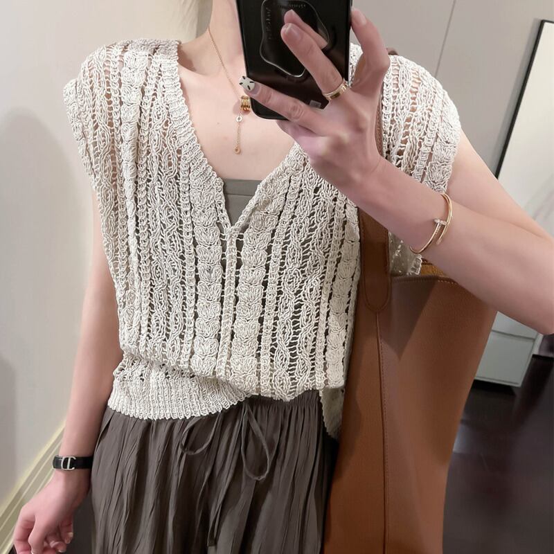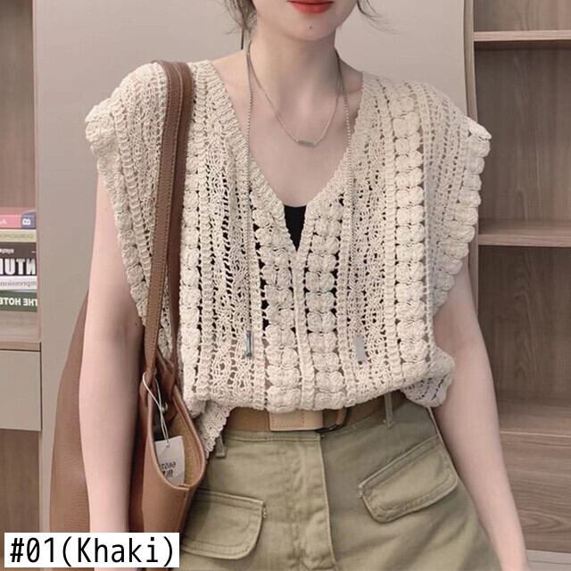 [EWQ] 中空フックフラワー薄手 Tシャツニットルーズ V ネックノースリーブ夏秋ベスト Tシャツ U782 サマー 夏物 オータム 秋物 Vネック フラワーデザイン