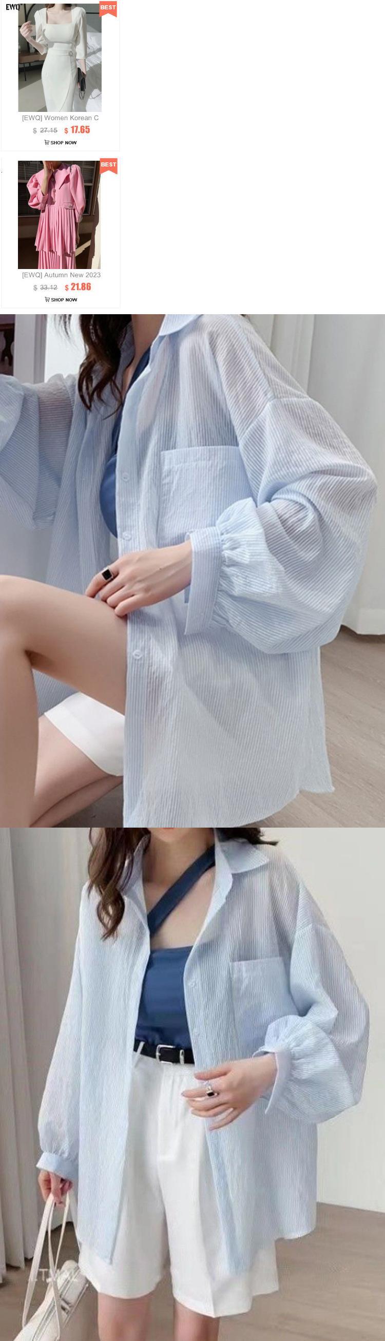 [EWQ] 夏ストライプシャツ薄いシングルブレストルーズ長袖ピンク潮視点ポケットスプライシングトップ ロング サマー 夏物
