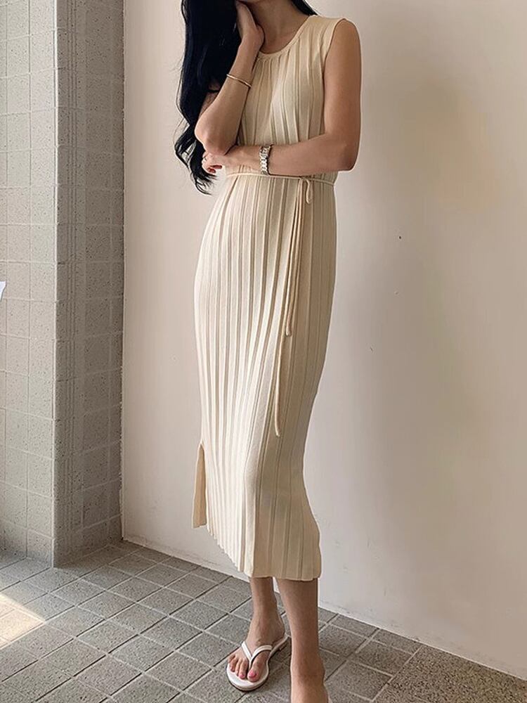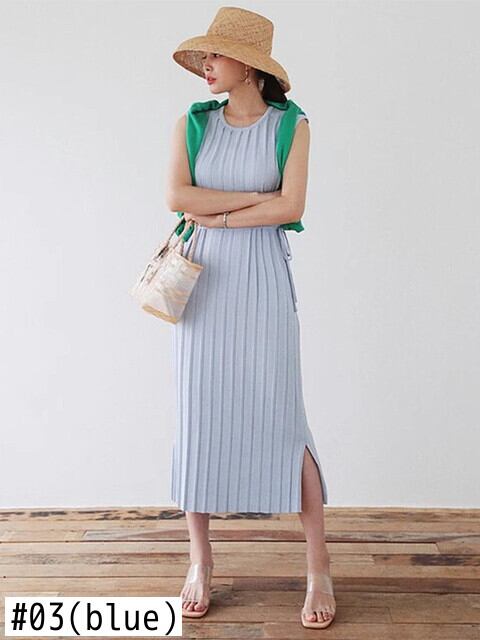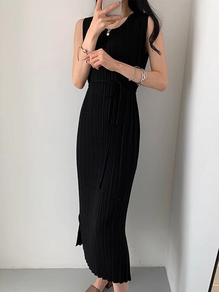 [EWQ] ニットレースアップベストドレスソリッドカラー O ネックノースリーブドレス夏トレンド 16U666 サマー 夏物 Oネック