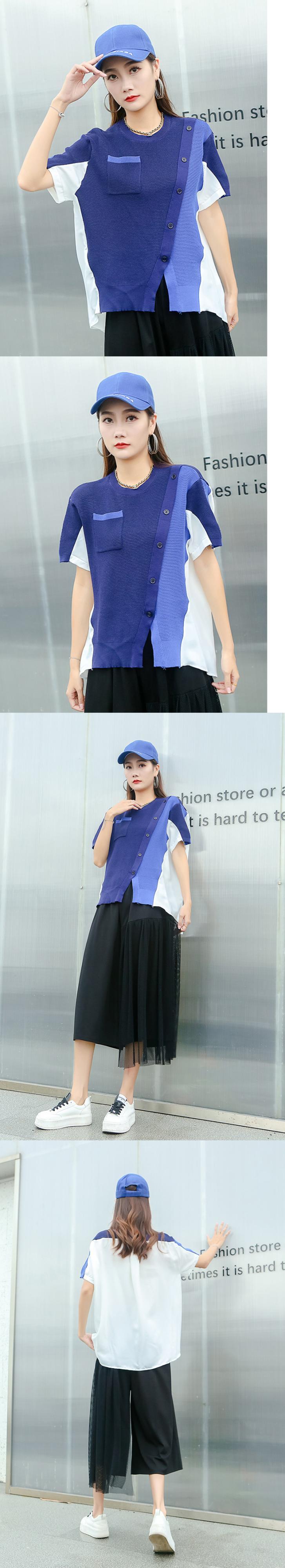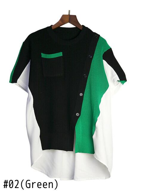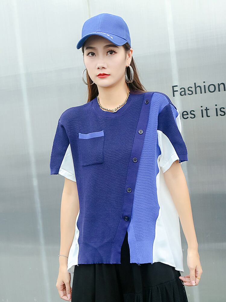 [EWQ] 不規則パッチワーク ニット Tシャツコントラスト半袖非対称シングルブレスト Tシャツ夏 ショート ハーフスリーブ サマー 夏物