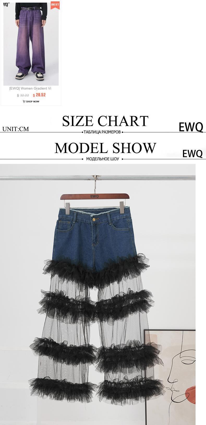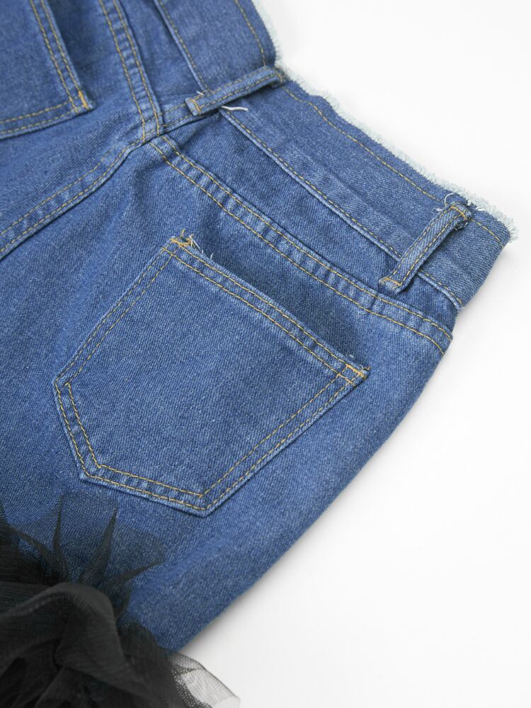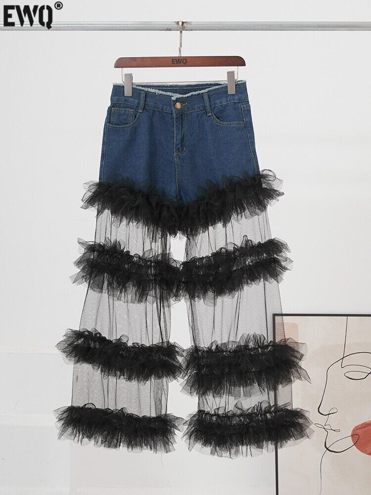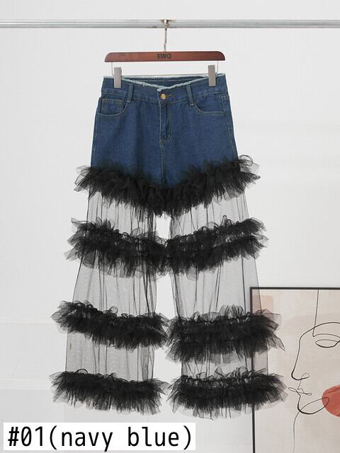 [EWQ] 裾メッシュパッチワークデニムパンツ遠近薄いストリートポケットウエスト夏潮ジーンズ 3121 サマー 夏物