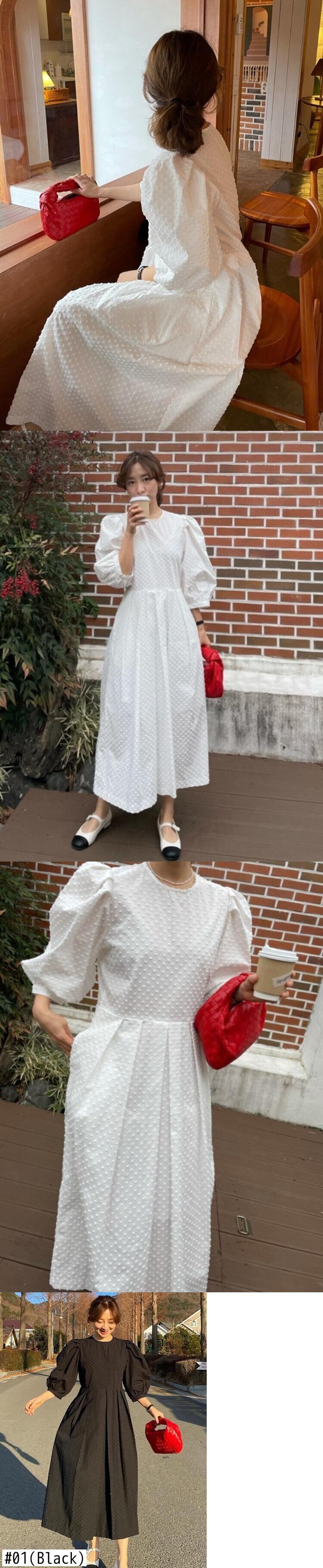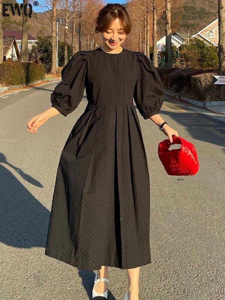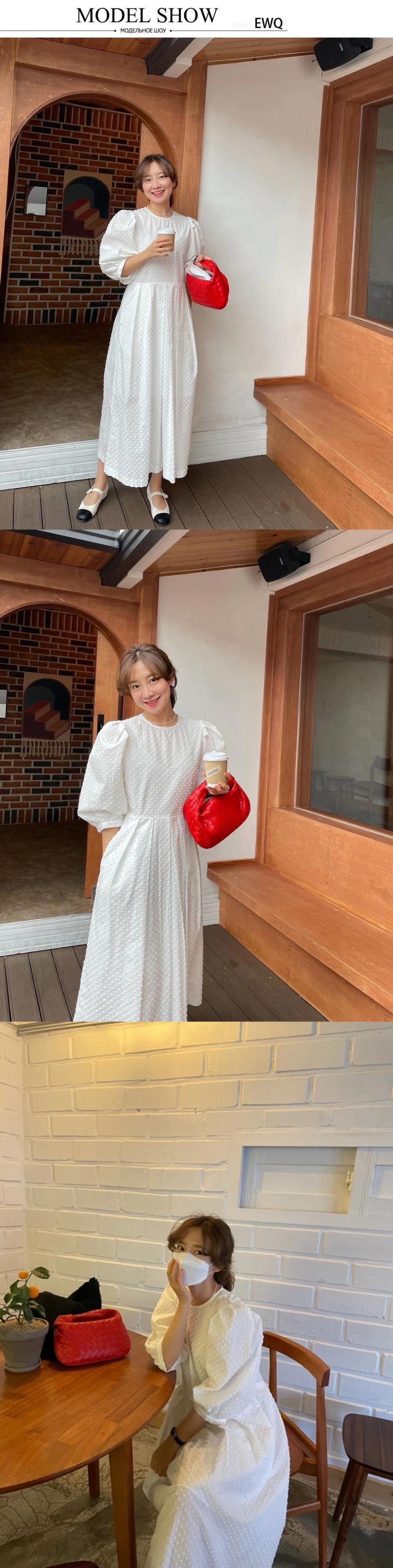 [EWQ] シックルーズラウンドネック立体粒状パフスリーブ無地ドレス春夏 16W2416 スプリング 春物 サマー 夏物 Oネック ソリッドカラー