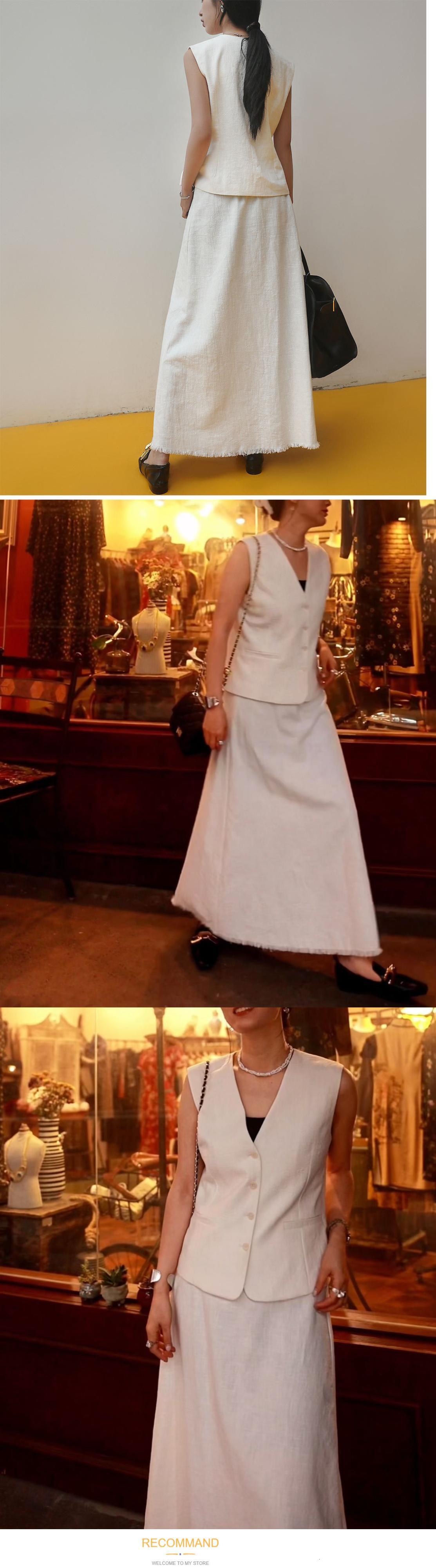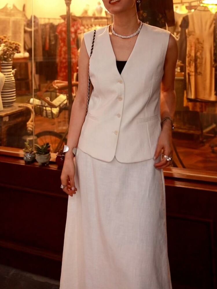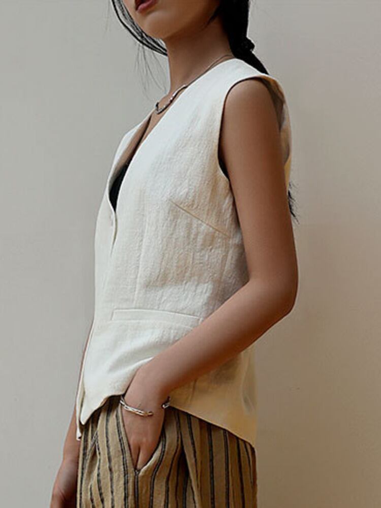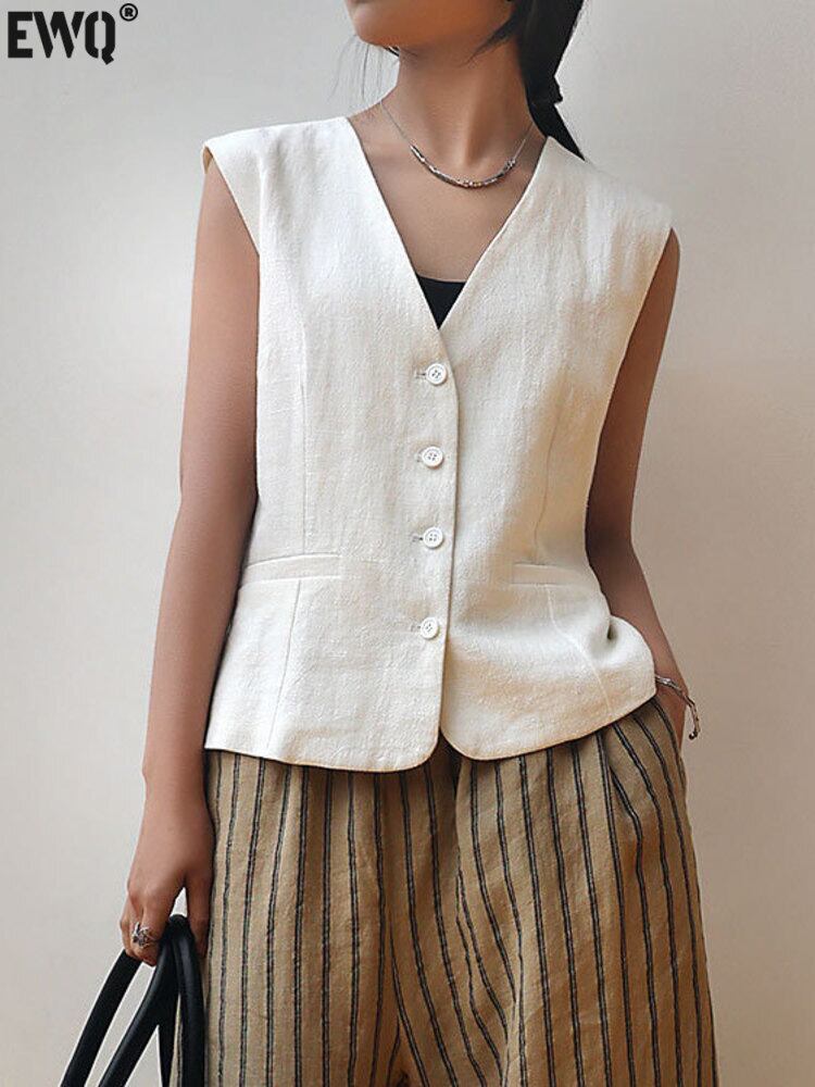 [EWQ] レディース V ネック ベスト リネン コットン シングルブレスト ホワイト ノースリーブ ジャケット ポケット 薄手 トップス 夏 サマー 夏物 Vネック