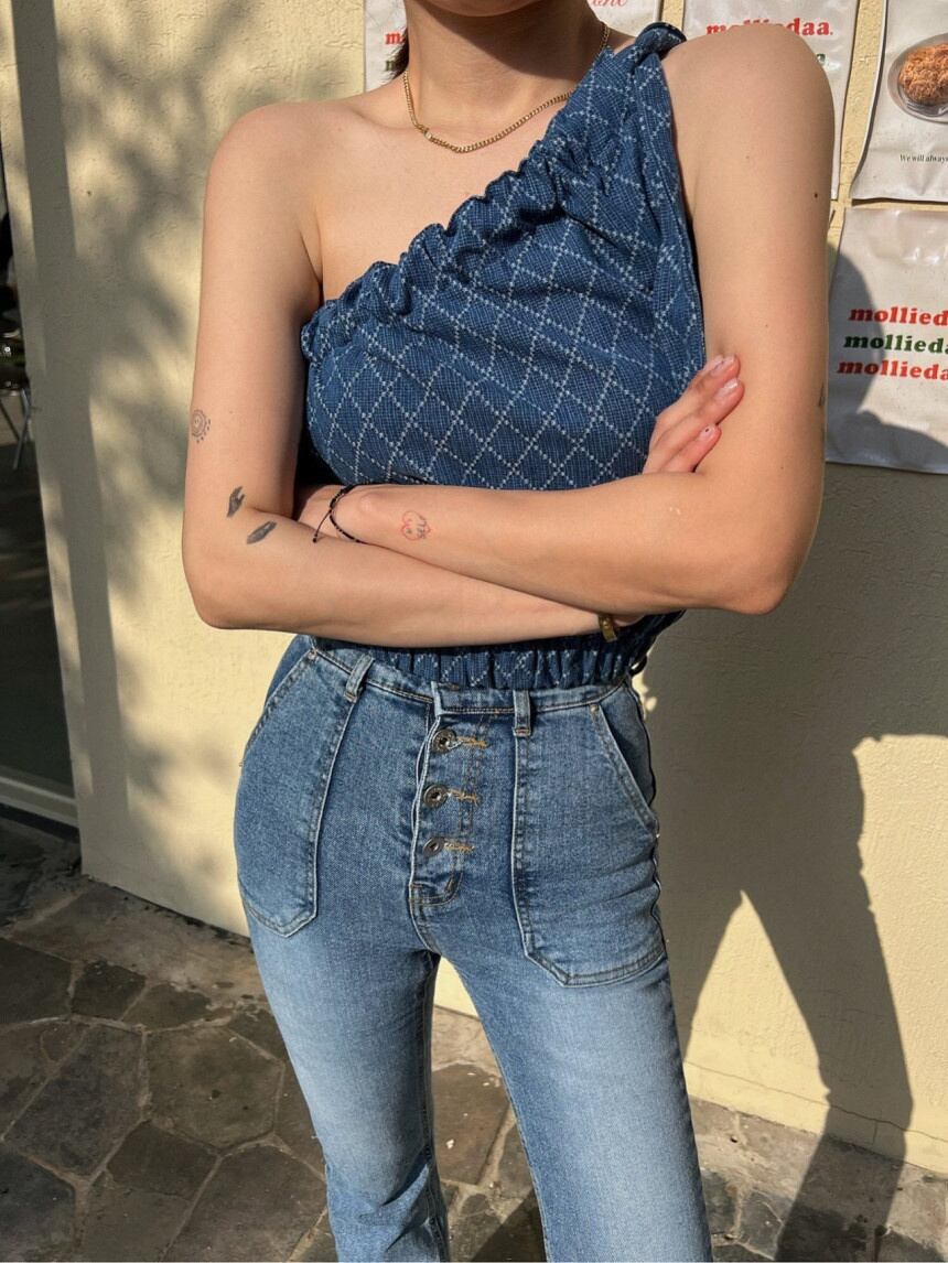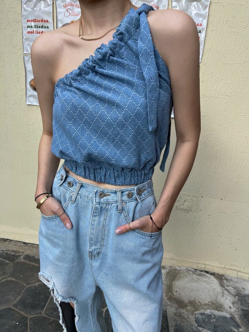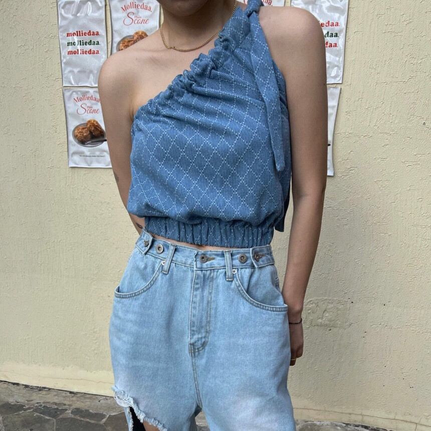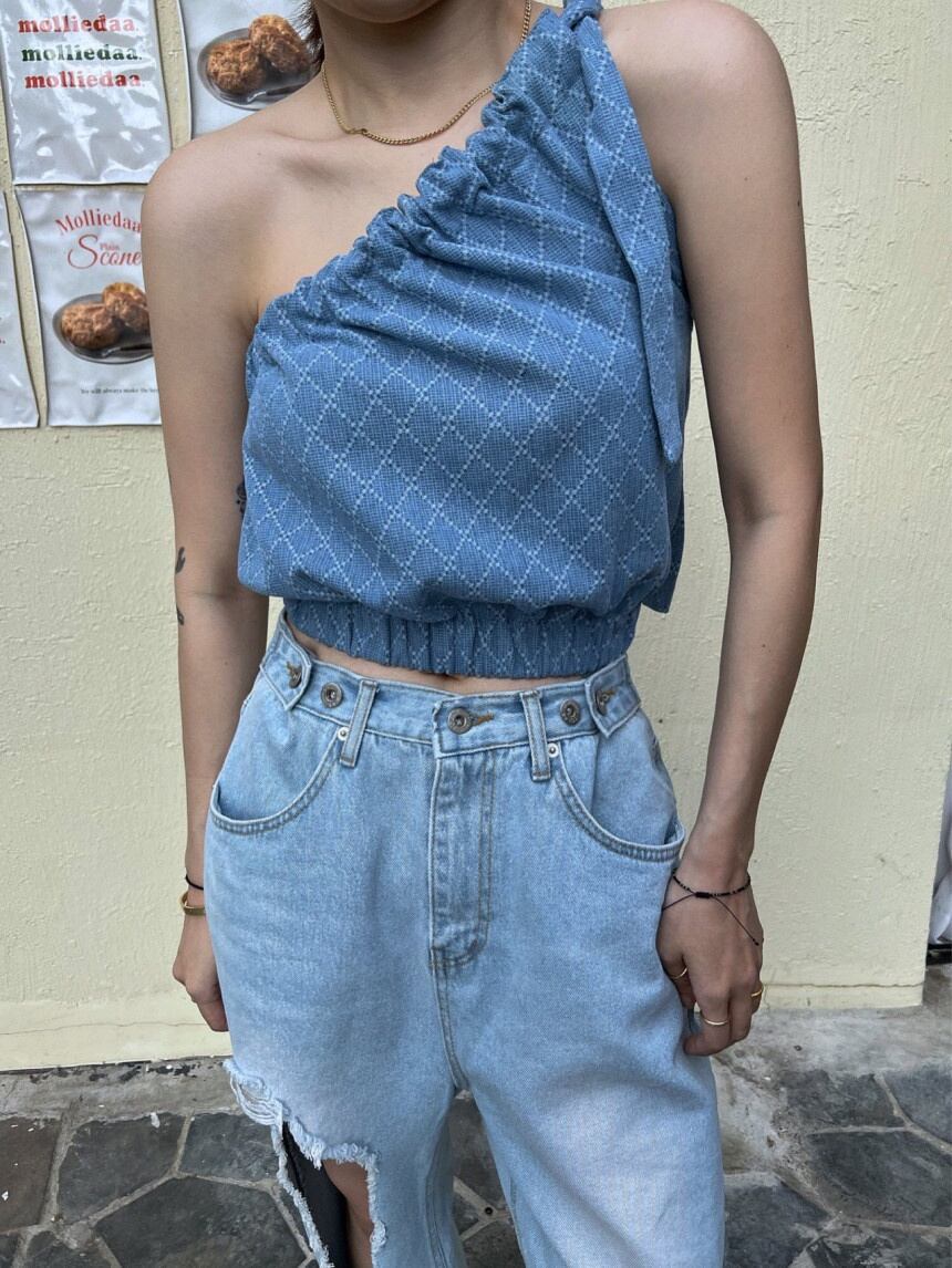 [EWQ] シングルショルダーベストブルーコントラストチェック柄オフショルダーレースアップ裾弾性タンクトップ夏潮服 13 エラスティック 伸縮 サマー 夏物