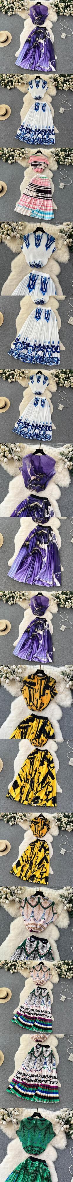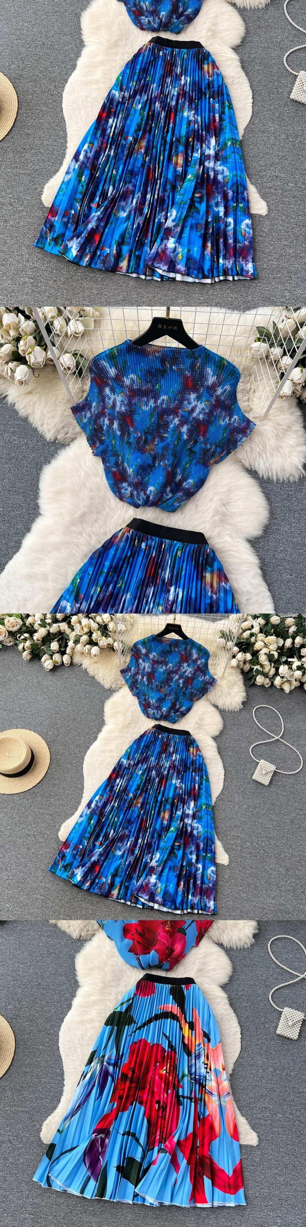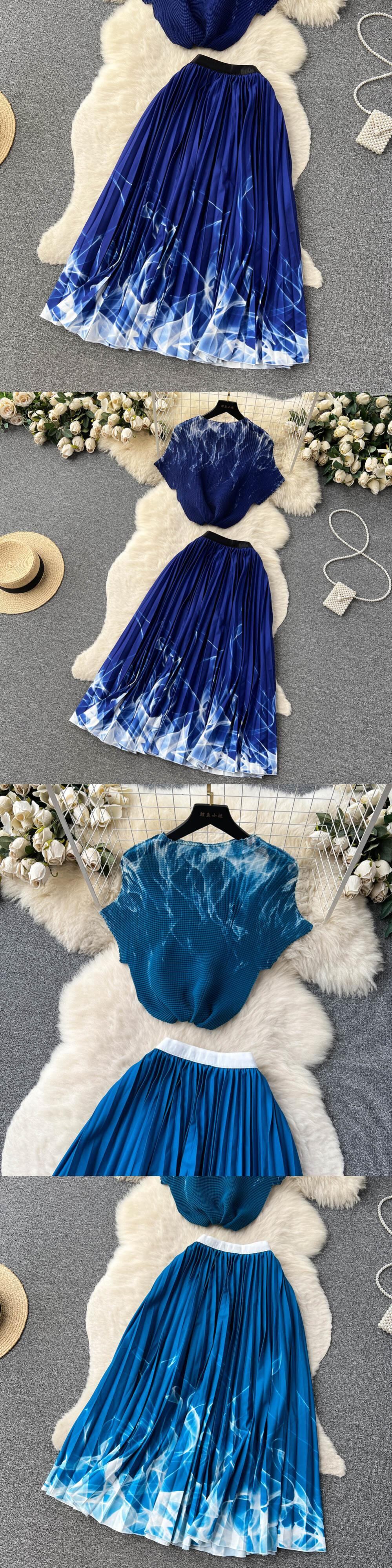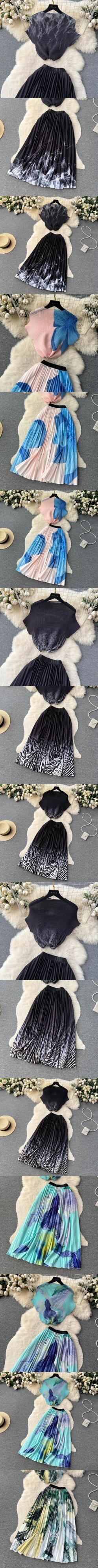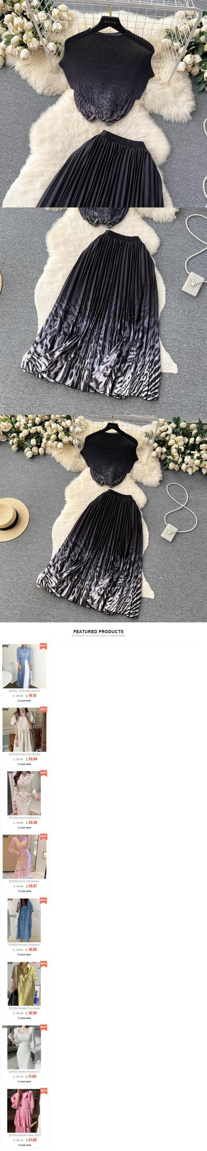[EWQ] コントラストプリーツトップウエストプリント A ラインスカートツーピーススーツ 30 色夏潮服 サマー 夏物 Aライン