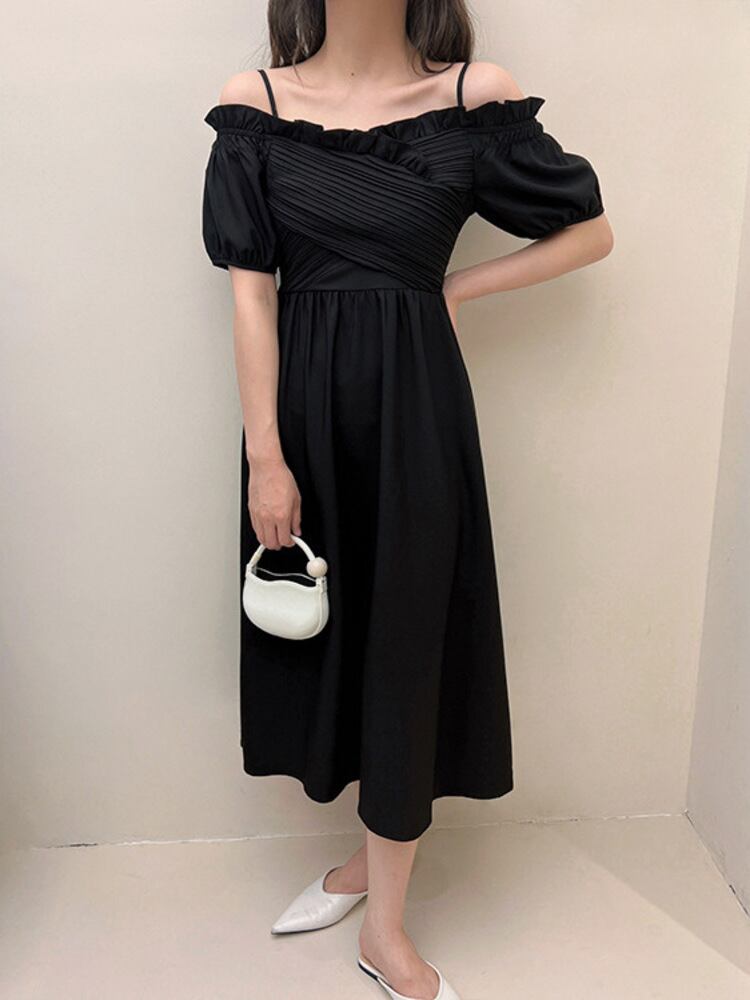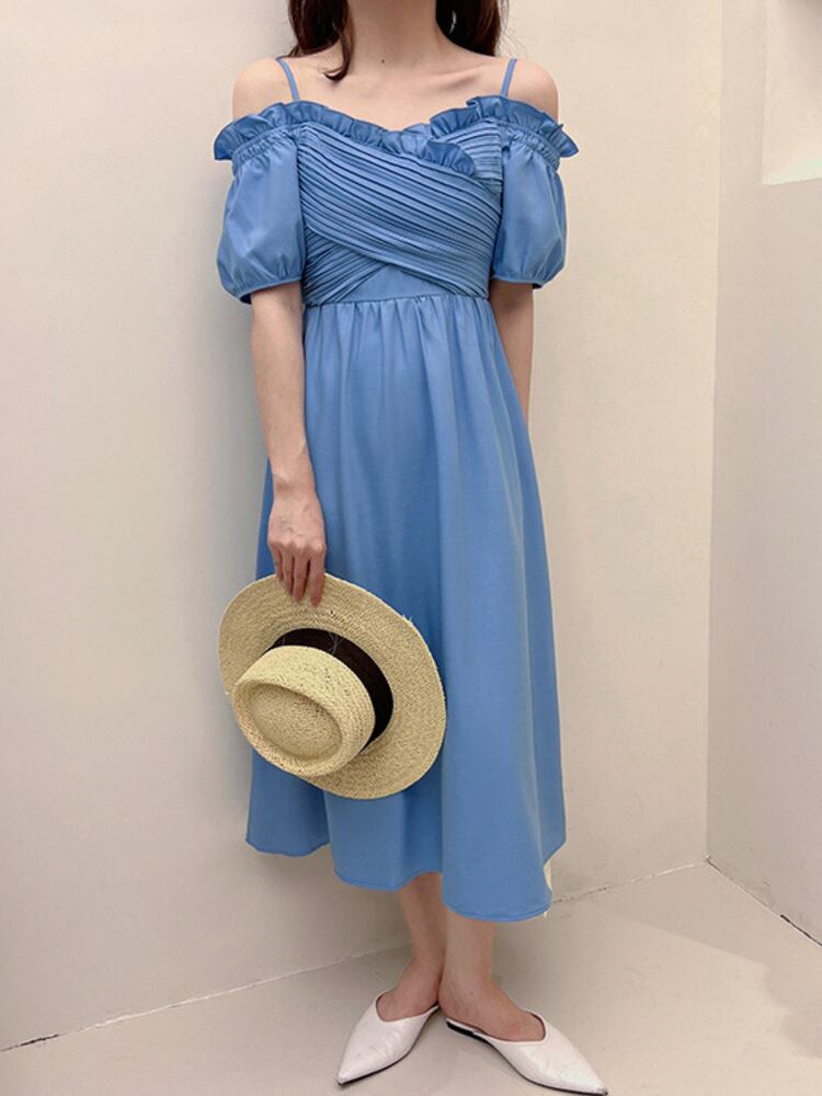 [EWQ] 真菌パッチワークグリーンドレス気質オフショルダーパフスリーブプリーツウエストドレスサマーローブ 夏物