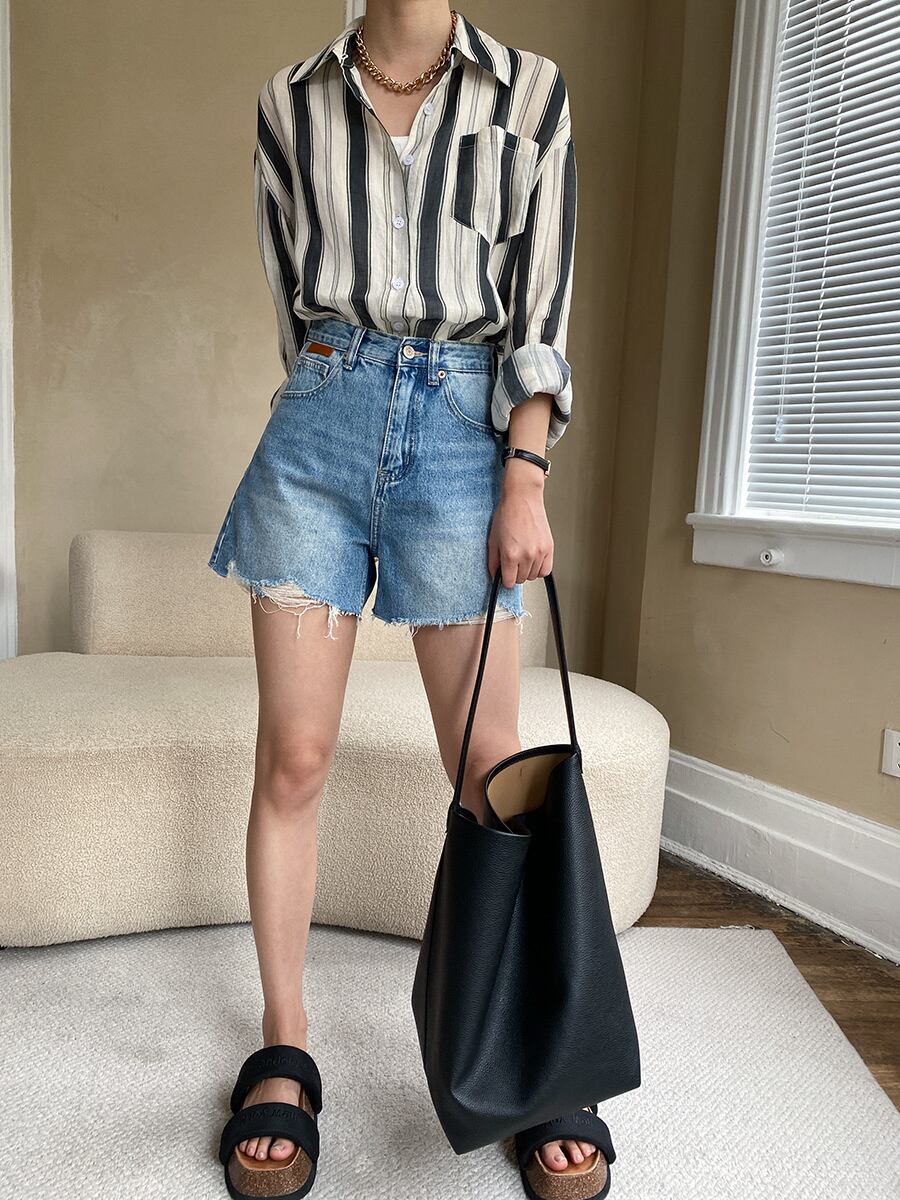 [EWQ] ストライプコントラストシャツルーズポケットラペル長袖ブラウス秋春 16O2501 ロング スプリング 春物 オータム 秋物