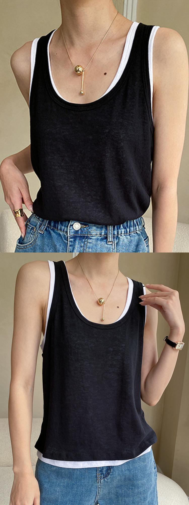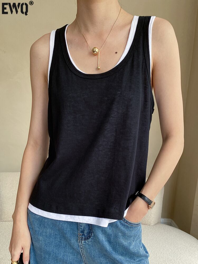 [EWQ] コントラストフェイクツーピースベストルーズパッチワークノースリーブタンクトップ夏トレンドニットトップス サマー 夏物
