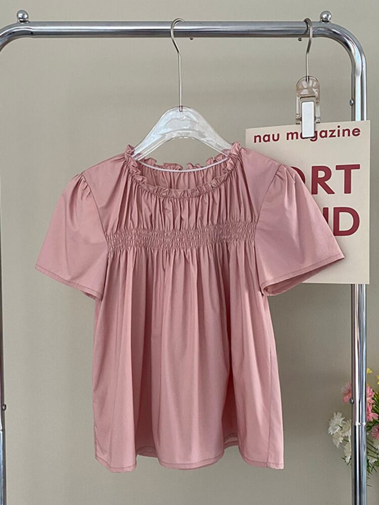 [EWQ] ピンクシャツオフショルダーソリッドカラープリーツパフスリーブルーズサマータイドブラウストップ 夏物
