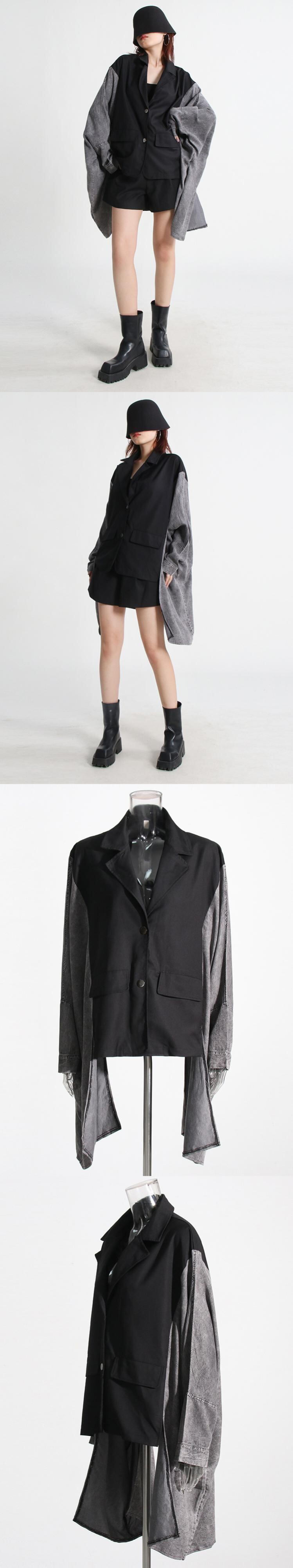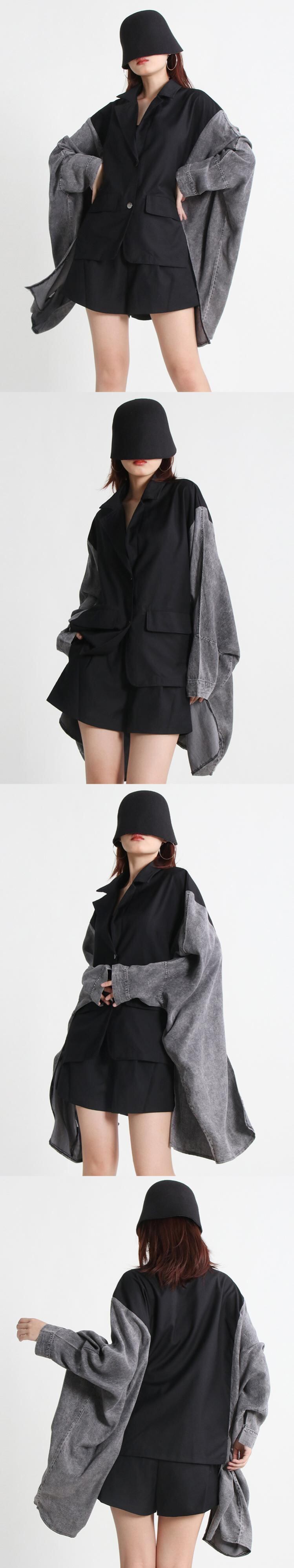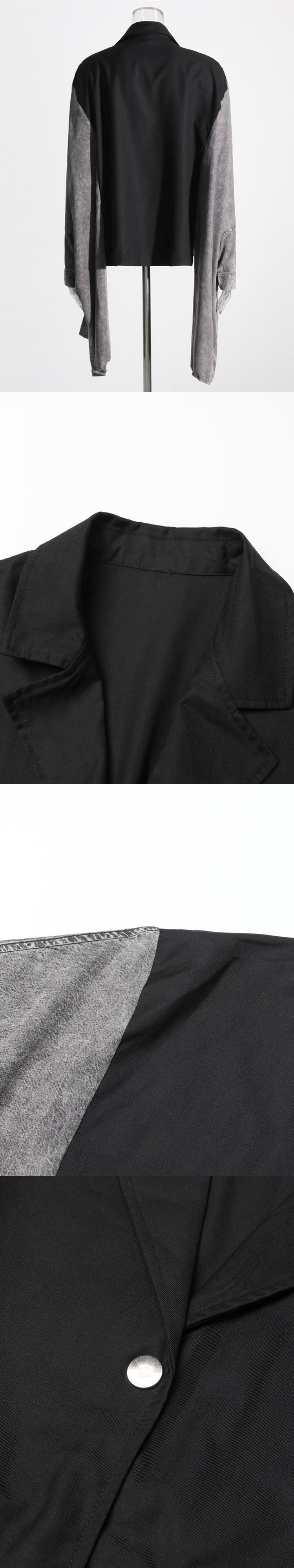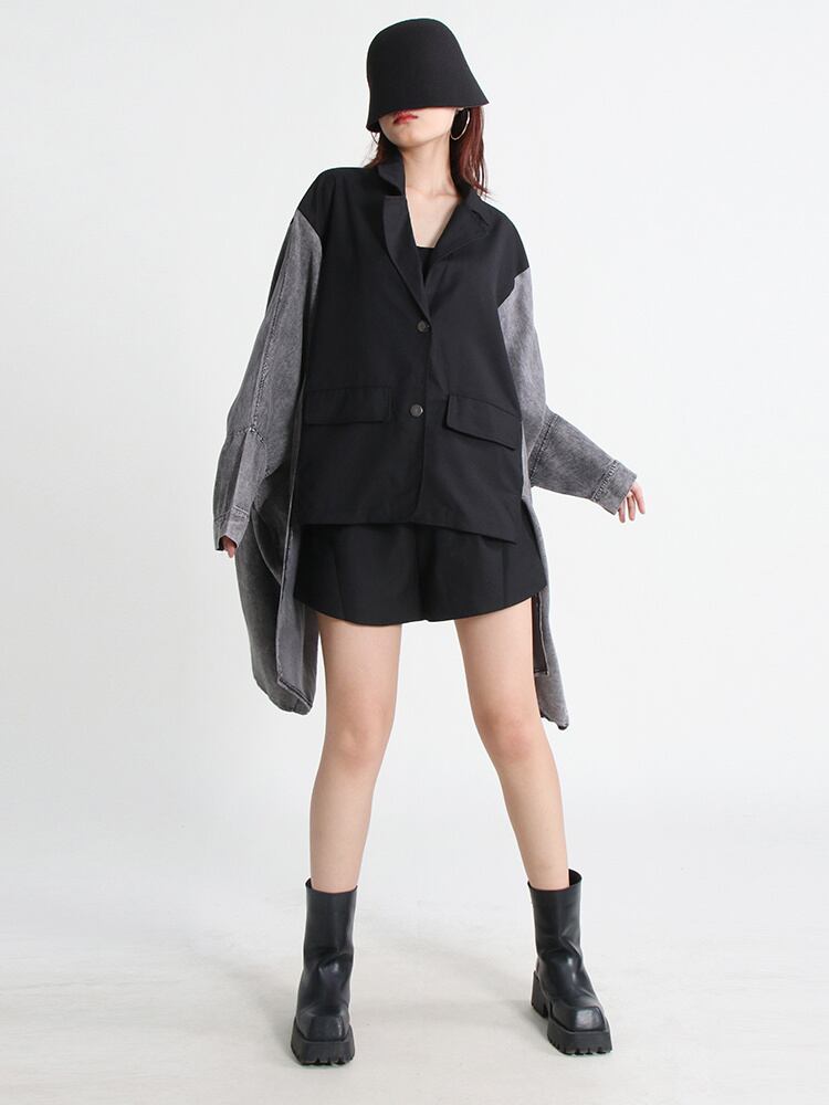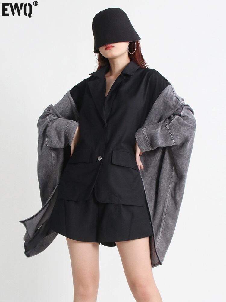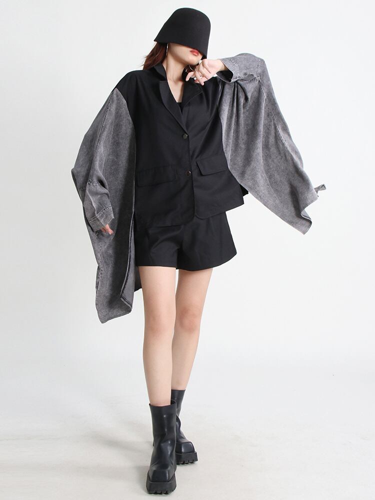 [EWQ] ヒットカラーコートラペルバットウィングスリーブパッチワークデニム気質バットスリーブコート秋 R310 オータム 秋物