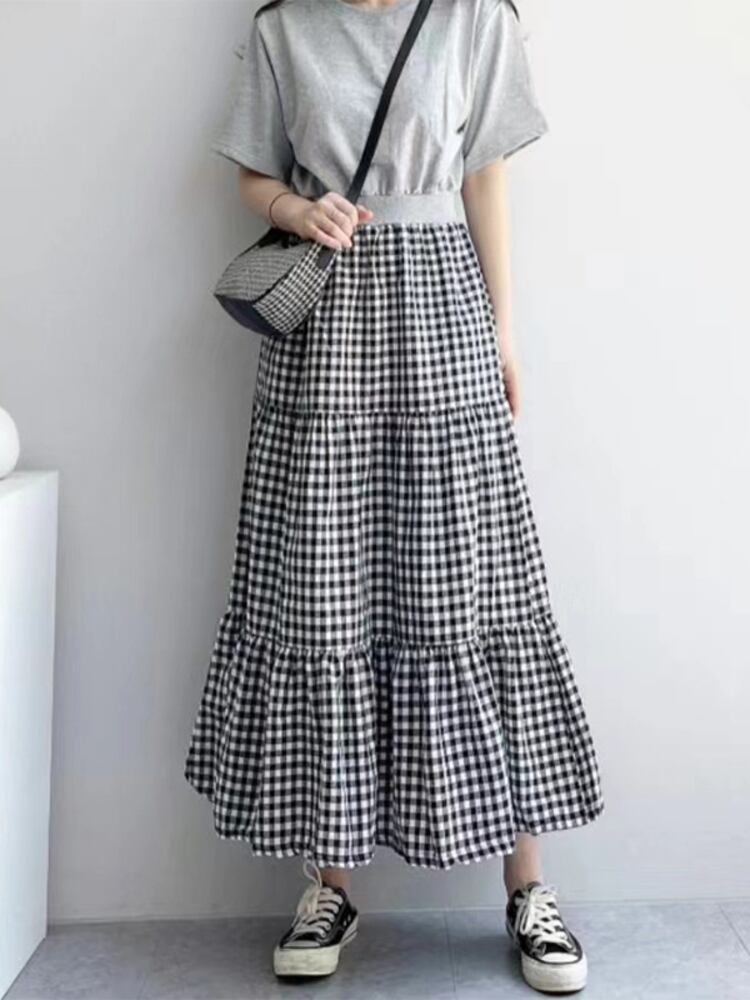 [EWQ] ステッチフェイクツーピースドレス半袖 Tシャツスプライスチェック柄コントラストドレス夏潮 Vestido ショート ハーフスリーブ サマー 夏物