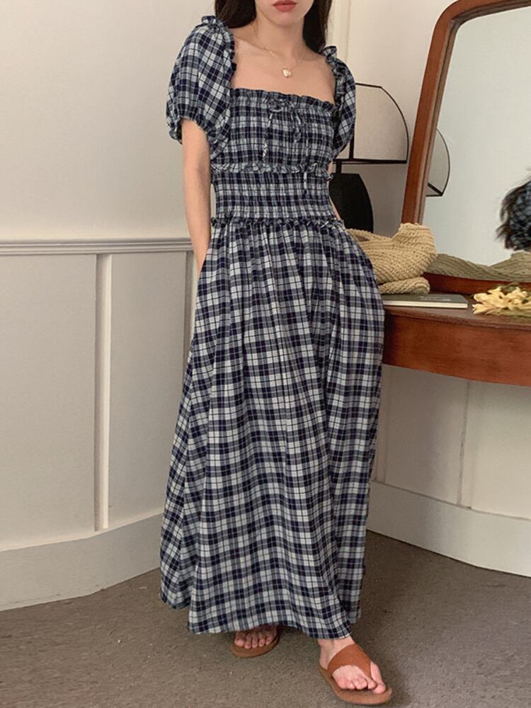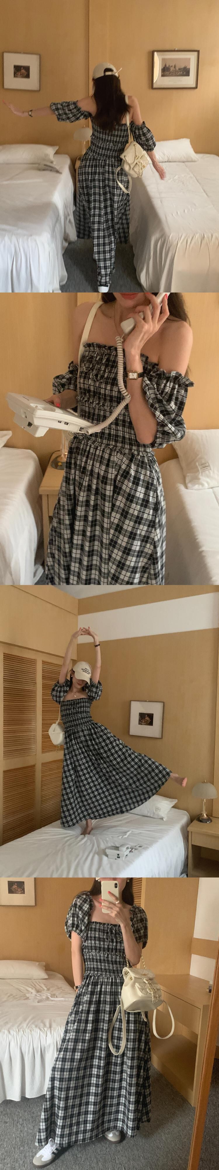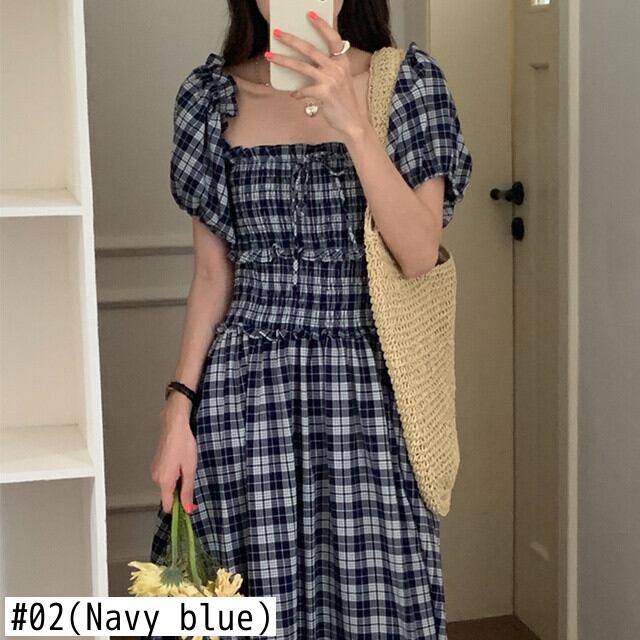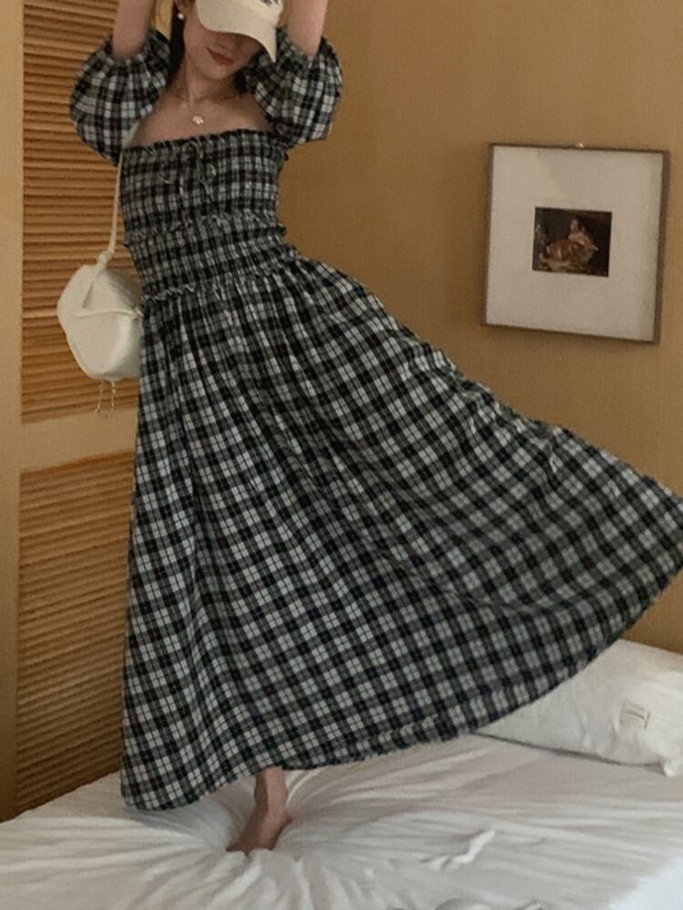 [EWQ] スクエアネックオフショルダーツーウェアドレスコントラストチェック柄プリーツウエストドレス夏潮 Vestido 6Y8876 サマー 夏物 スクウェア