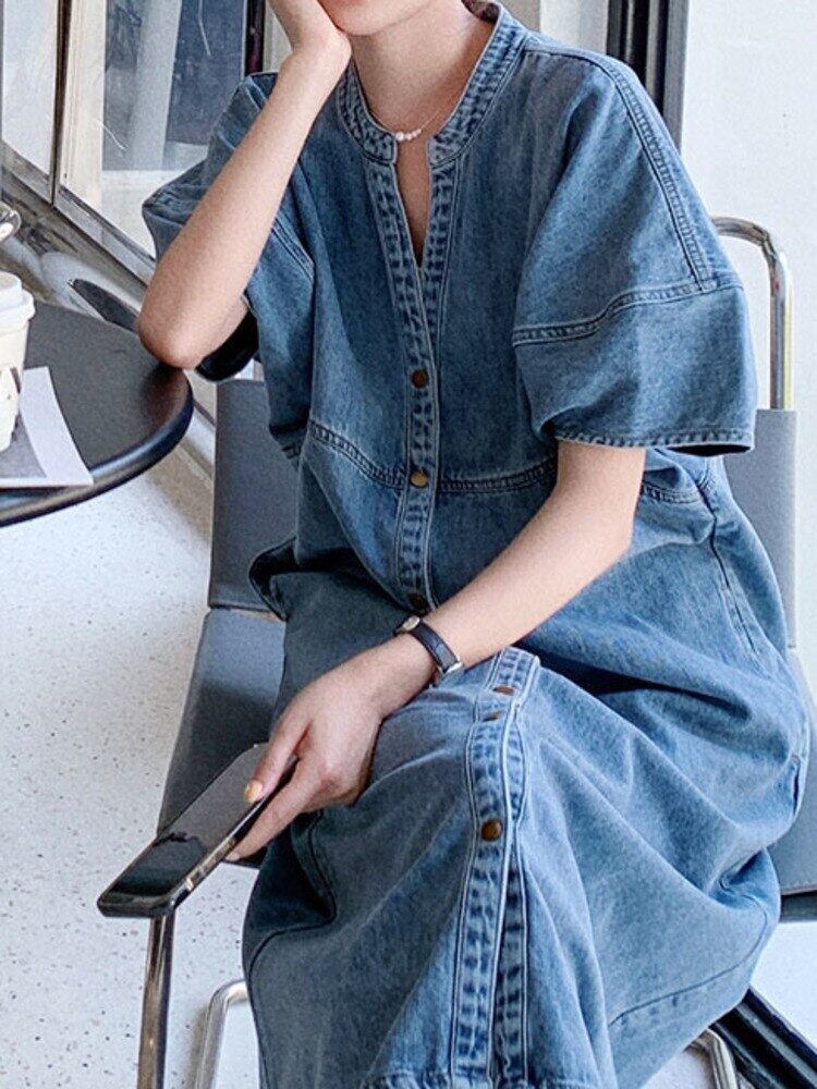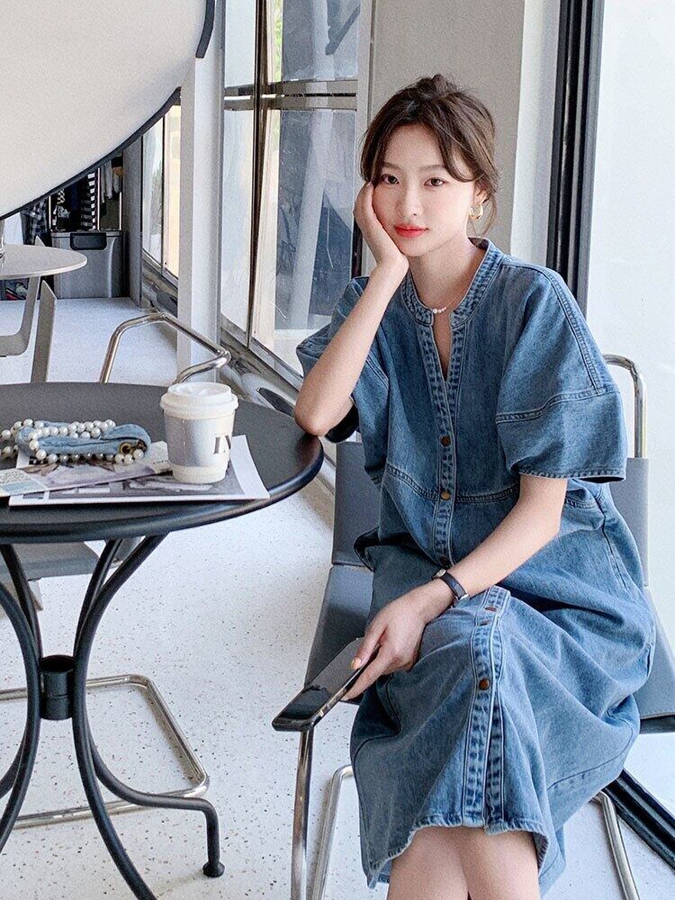 [EWQ] 半袖デニムドレス夏ルーズストリート V ネックシングルブレストドレス 16Y9330 ショート ハーフスリーブ サマー 夏物 Vネック