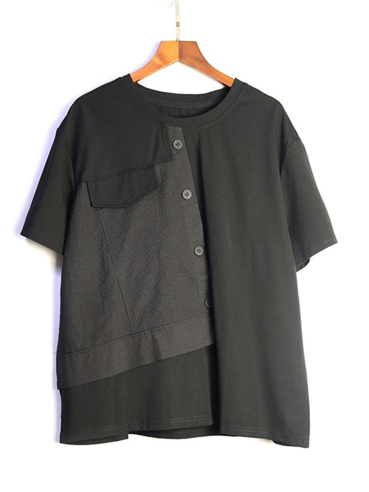 [EWQ] 白 Tシャツ半袖コントラストカラーパッチワークボタン O ネック Tシャツ夏潮 T シャツ 16Y9674 ショート ホワイト ハーフスリーブ サマー 夏物 Oネック