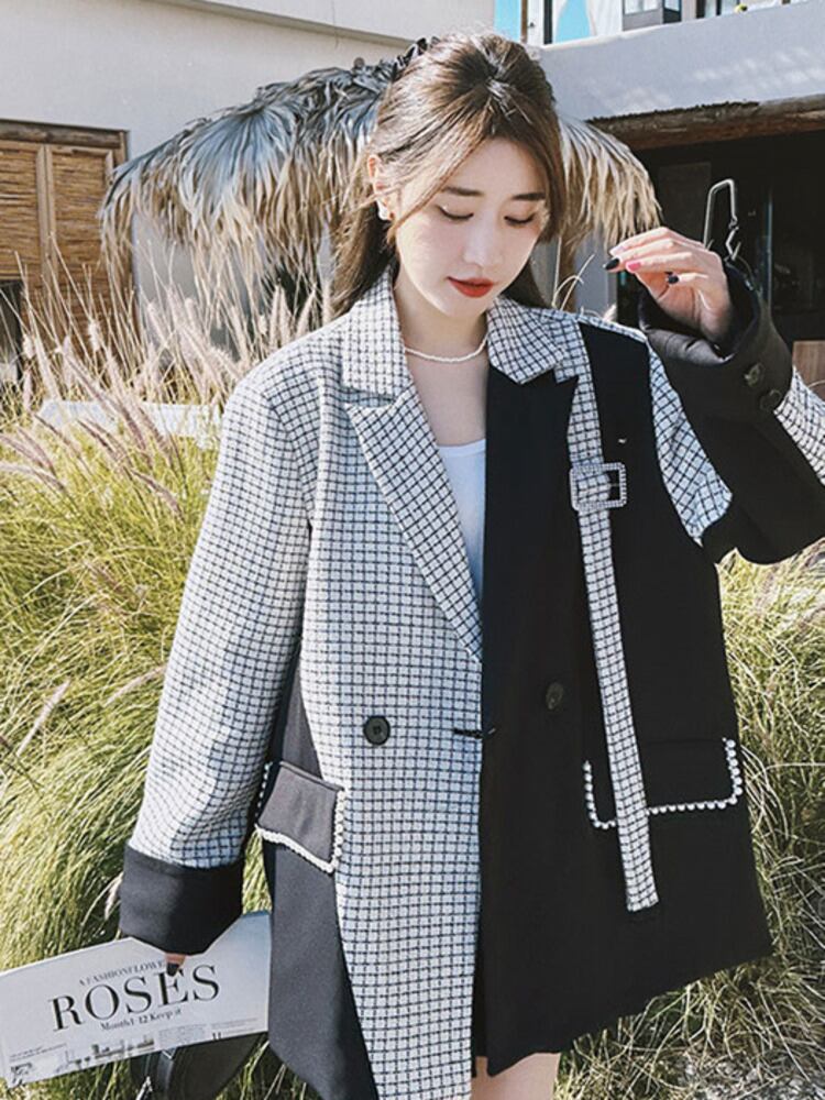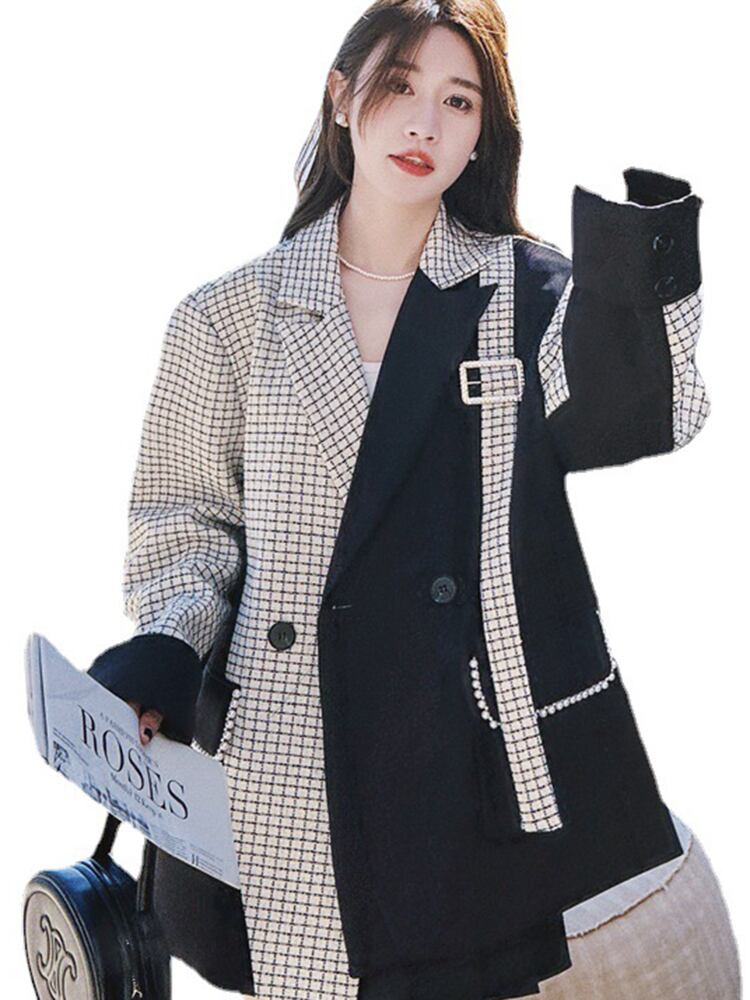 [EWQ] チェック柄パッチワークブレザーコート長袖包帯コントラストカラールーズスーツジャケット春秋 16U605 ロング スプリング 春物 オータム 秋物