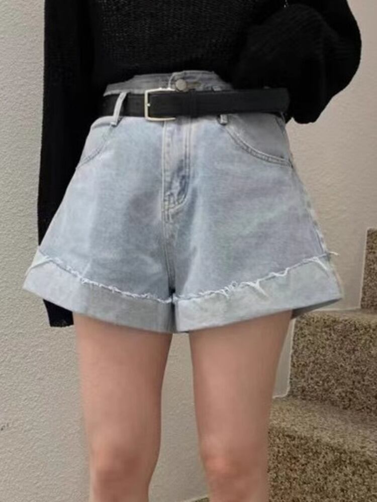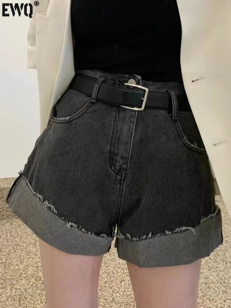 [EWQ] ストリートデニムショートパンツベルトパッチワークテルウエストポケットホットショートジーンズ夏 532 サマー 夏物 ハーネス ショーツ ブルマー
