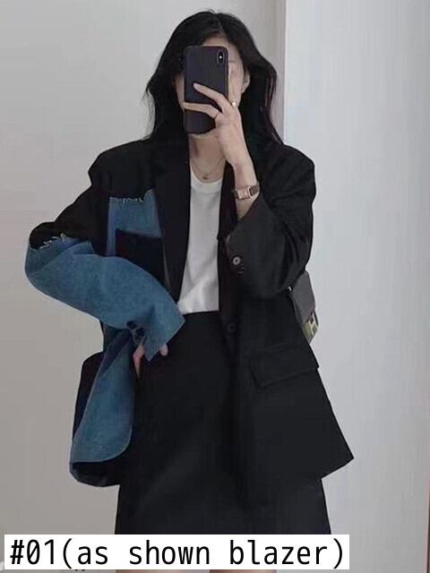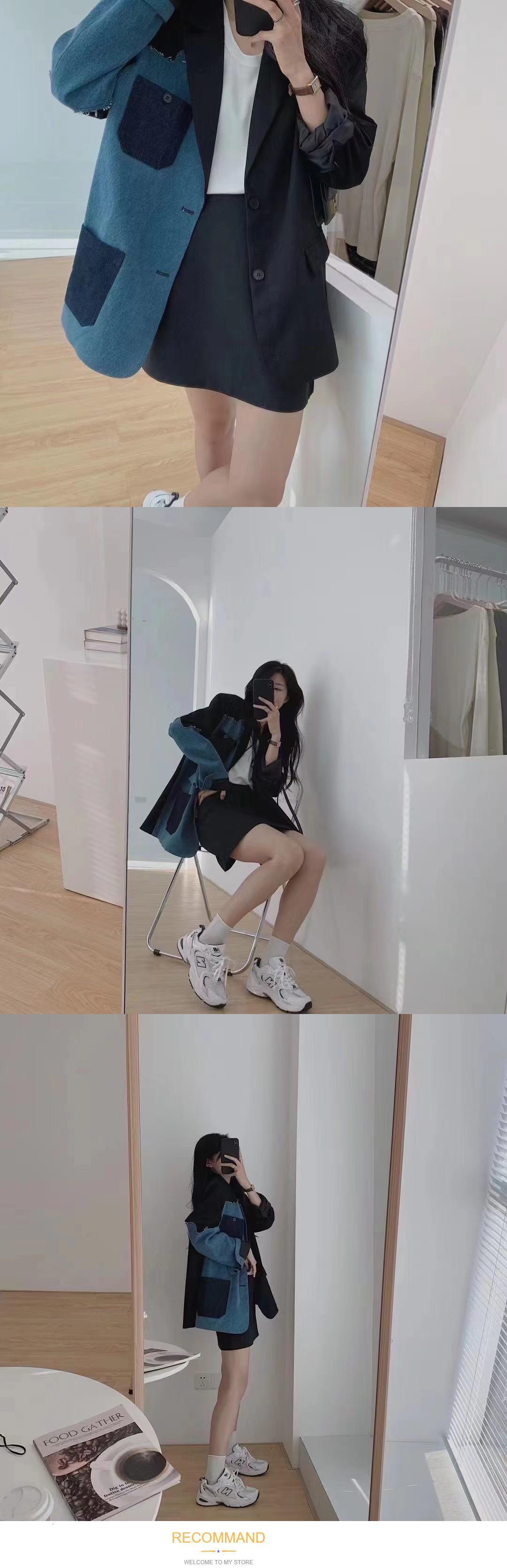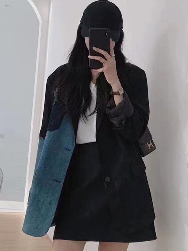[EWQ] パッチワークコントラストブレザーコート長袖ルーズポケットスプライススーツジャケット春秋ブレザー ロング スプリング 春物 オータム 秋物
