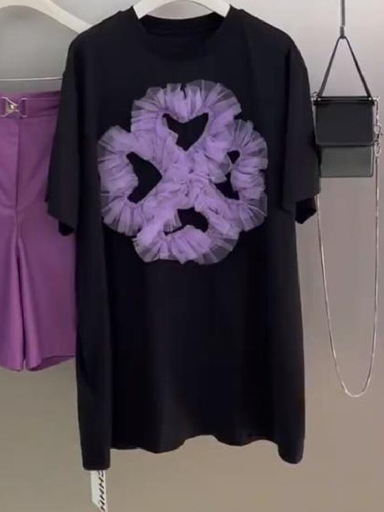[EWQ] 黒 Tシャツ半袖ルーズ 3D ガーゼパッチワーク O ネック Tシャツ夏潮 Tシャツ 16U709 ショート ブラック ハーフスリーブ サマー 夏物 Oネック