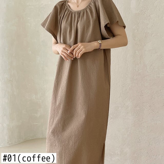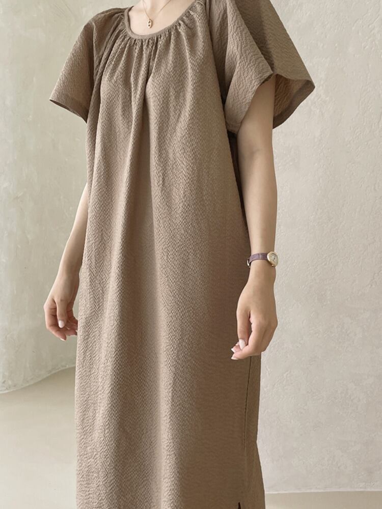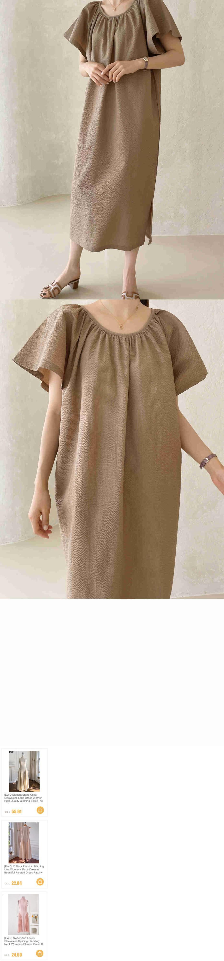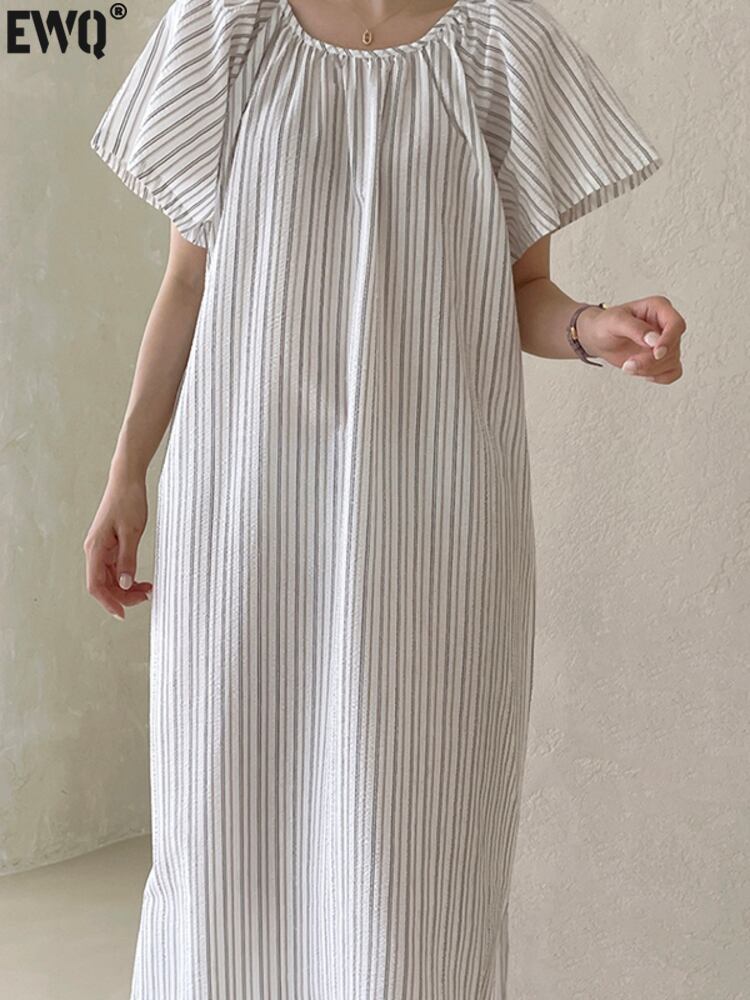 [EWQ] ストライプコントラストドレス O ネックひだ半袖ルーズサイドスプリットドレス夏潮 Vestido 6U678 ショート ハーフスリーブ サマー 夏物 Oネック