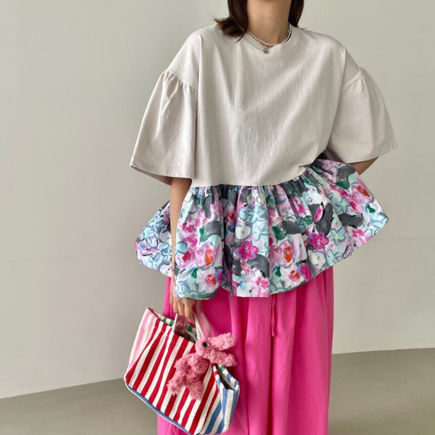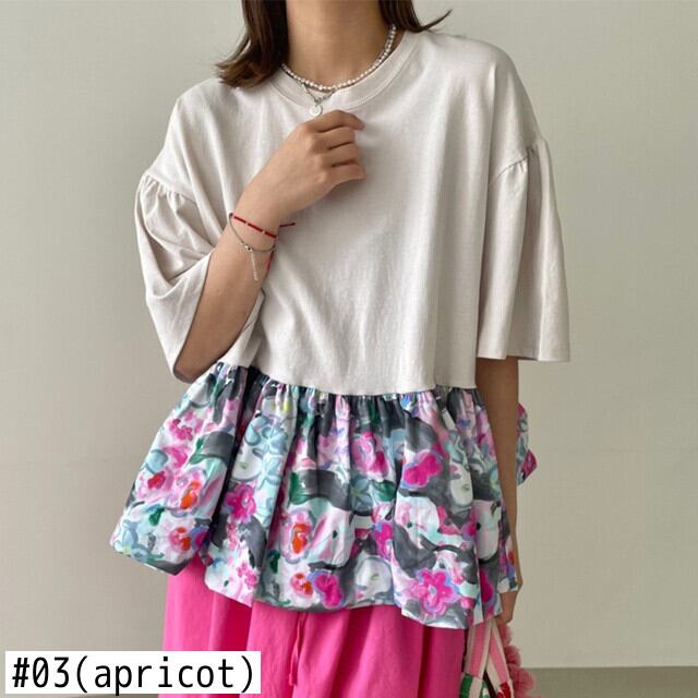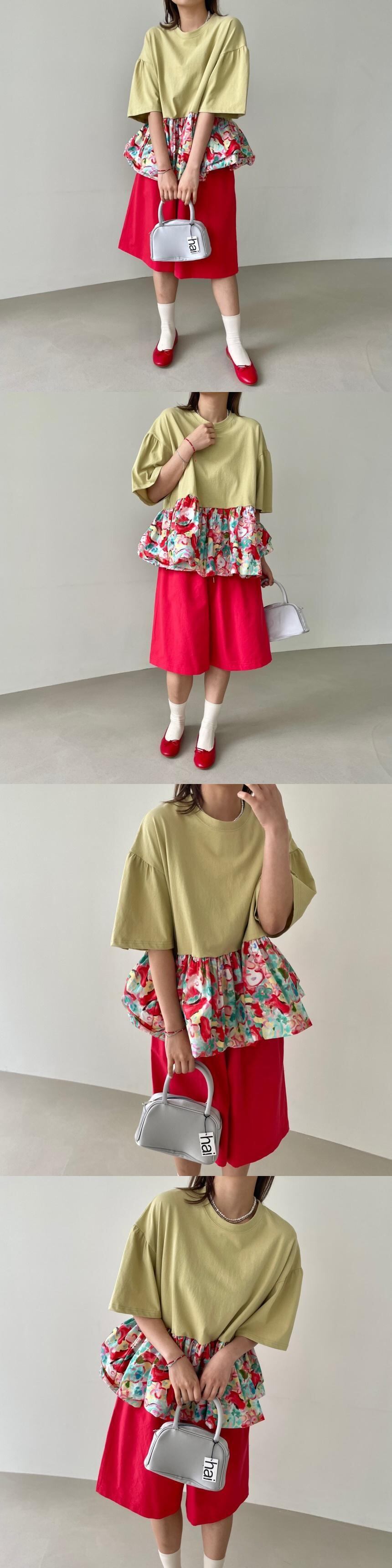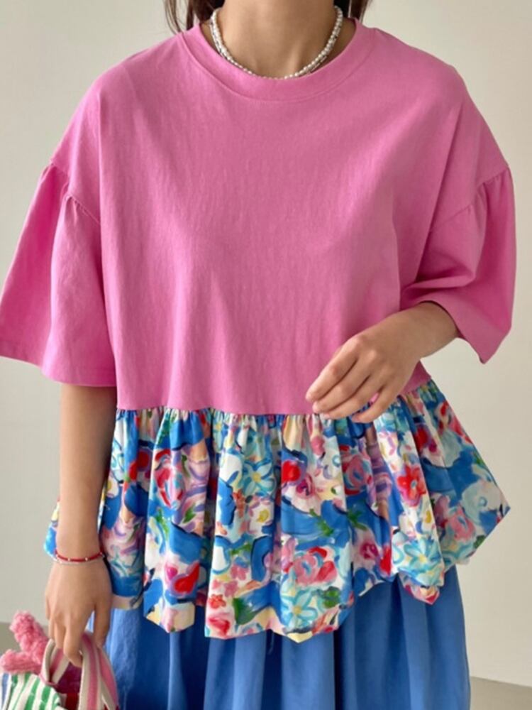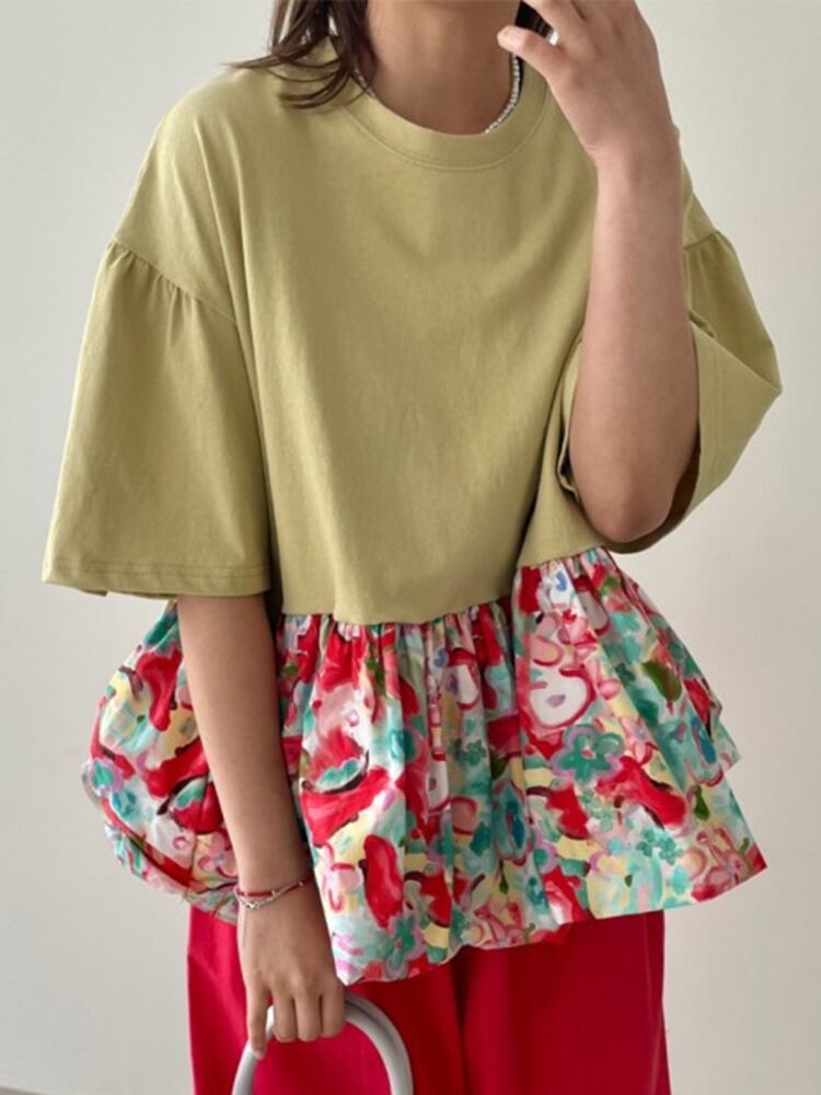 [EWQ] フリルパッチワーク花柄 Tシャツフェイクツーピースルーズ半袖 Tシャツ夏潮 O ネック Tシャツ ショート ハーフスリーブ サマー 夏物 Oネック