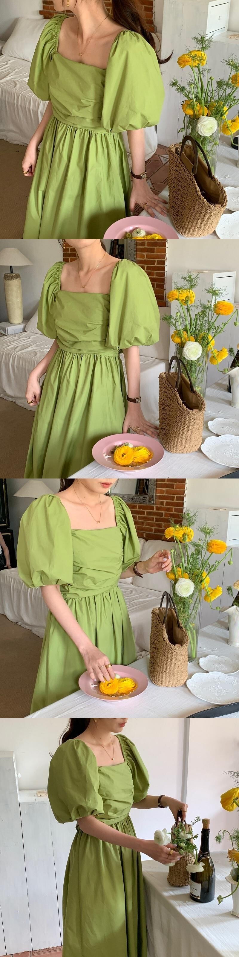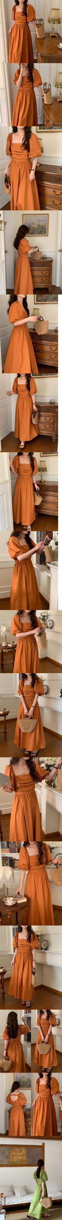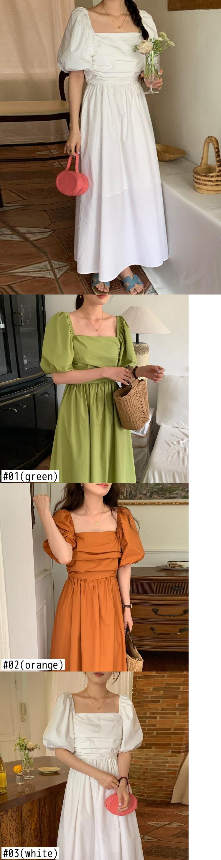 [EWQ] スクエアネックバックレスドレスソリッドカラープリーツウエストミディドレス夏潮パフスリーブ Vestidos サマー 夏物 スクウェア