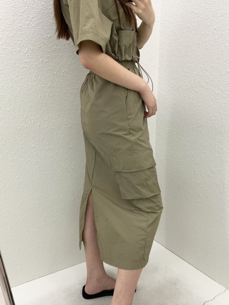 [EWQ] セットダブルジッパー巾着シャツ + 弾性ウエストポケットスプライスバックスプリットスカートサマースーツ エラスティック 伸縮 夏物