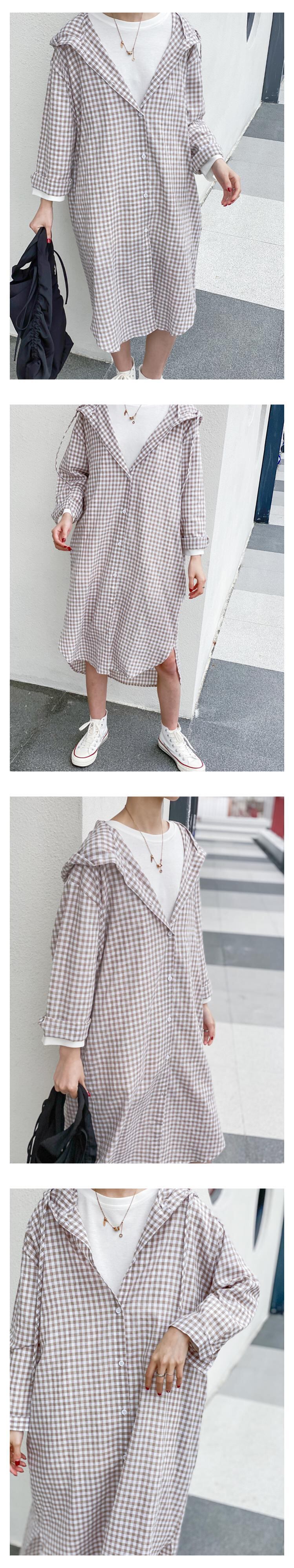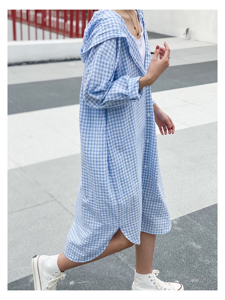 [EWQ] 裾非対称チェック柄シャツ ランタンスリーブ フード付き ルーズフィット 夏 アウター ロング 夏潮 16U414 サマー 夏物
