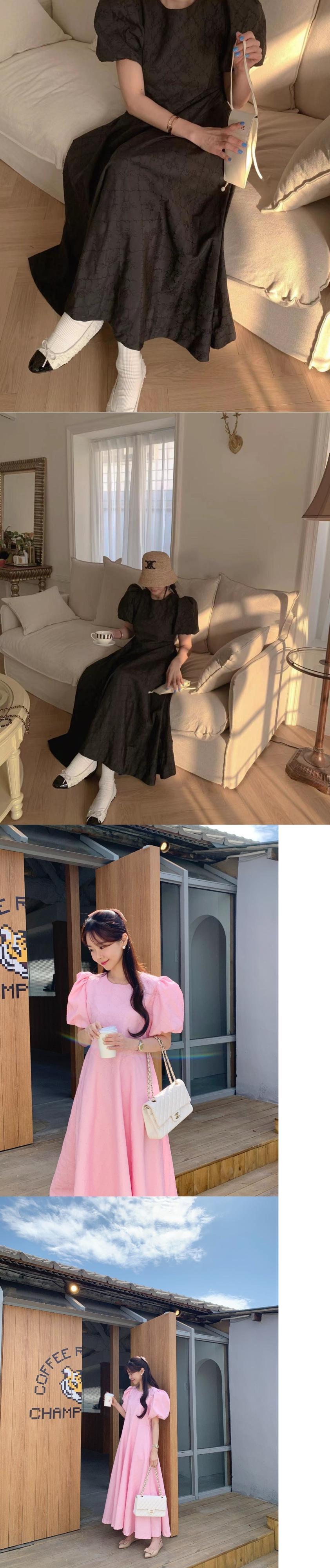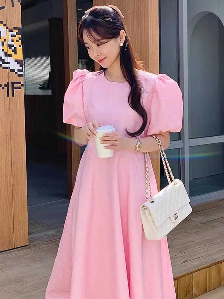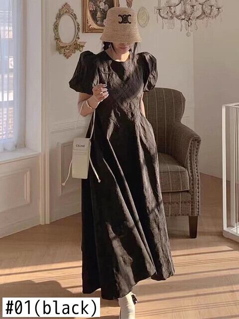 [EWQ] 韓国シックパフスリーブドレスルーズパターンウエスト O ネック Vestido 夏トレンド 16U734 サマー 夏物 Oネック