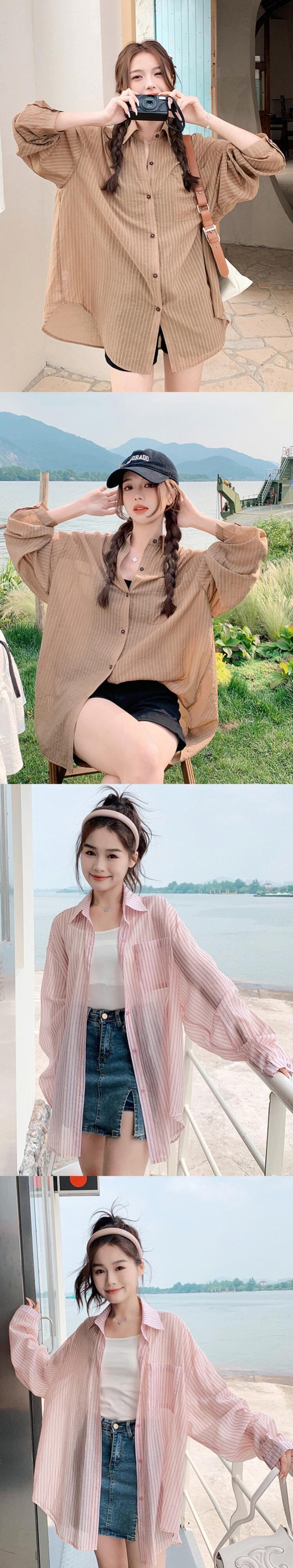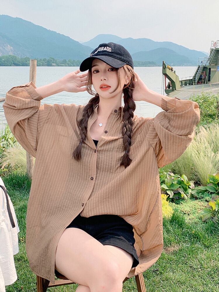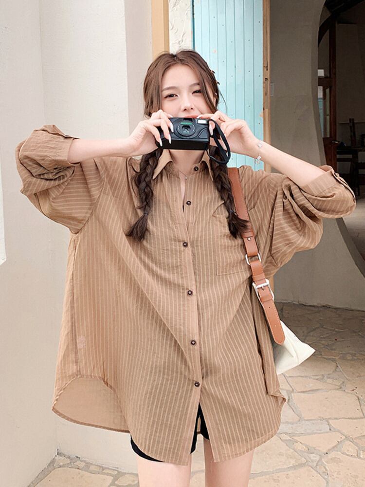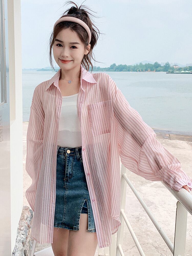 [EWQ] 薄手シャツ ゆったり 長袖 レディース ストライプ コントラストカラー やや透け感 夏潮 ロング サマー 夏物