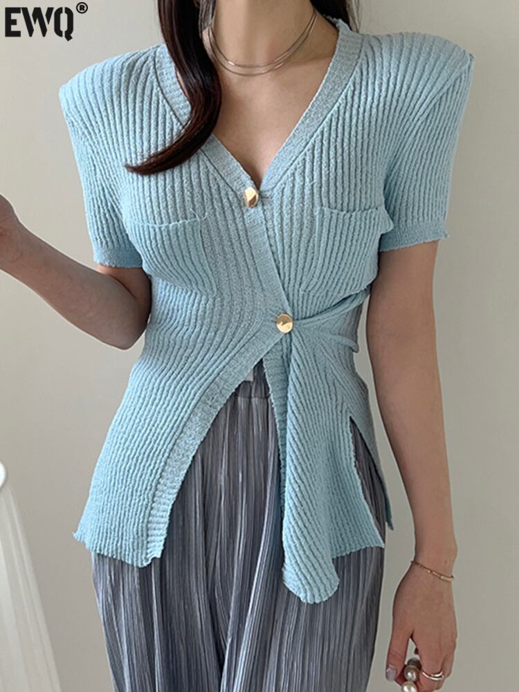[EWQ] V ネックニット Tシャツスリム不規則スプリット半袖ポケットスプライス Tシャツトップ夏潮 T シャツ ショート ハーフスリーブ サマー 夏物 Vネック