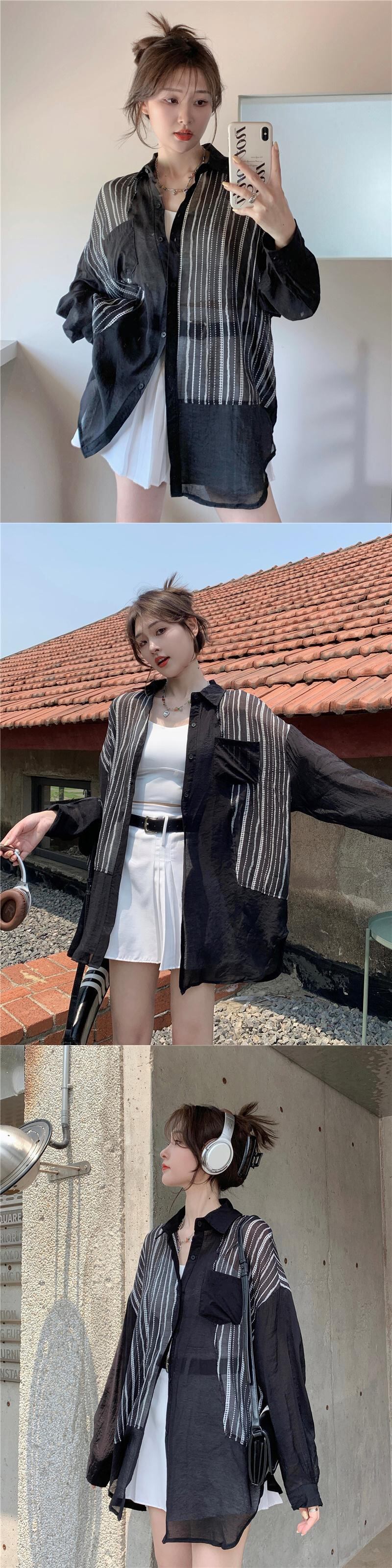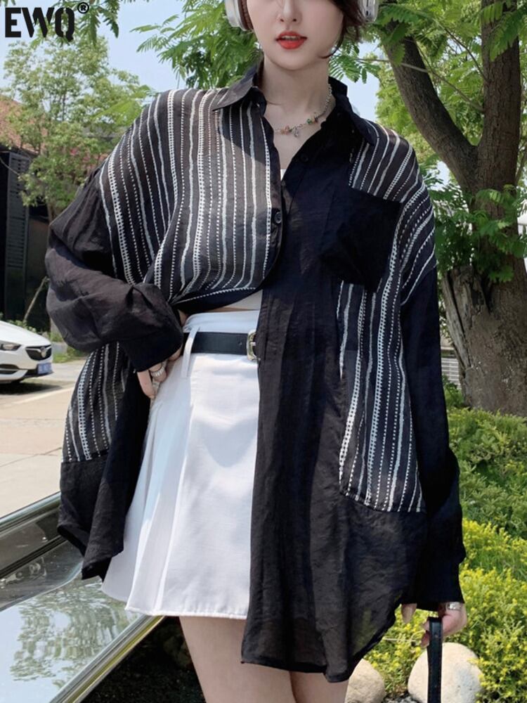 [EWQ] ストライプパッチワーク薄手シャツシングルブレストポケットスプライスブラウス夏潮 サマー 夏物