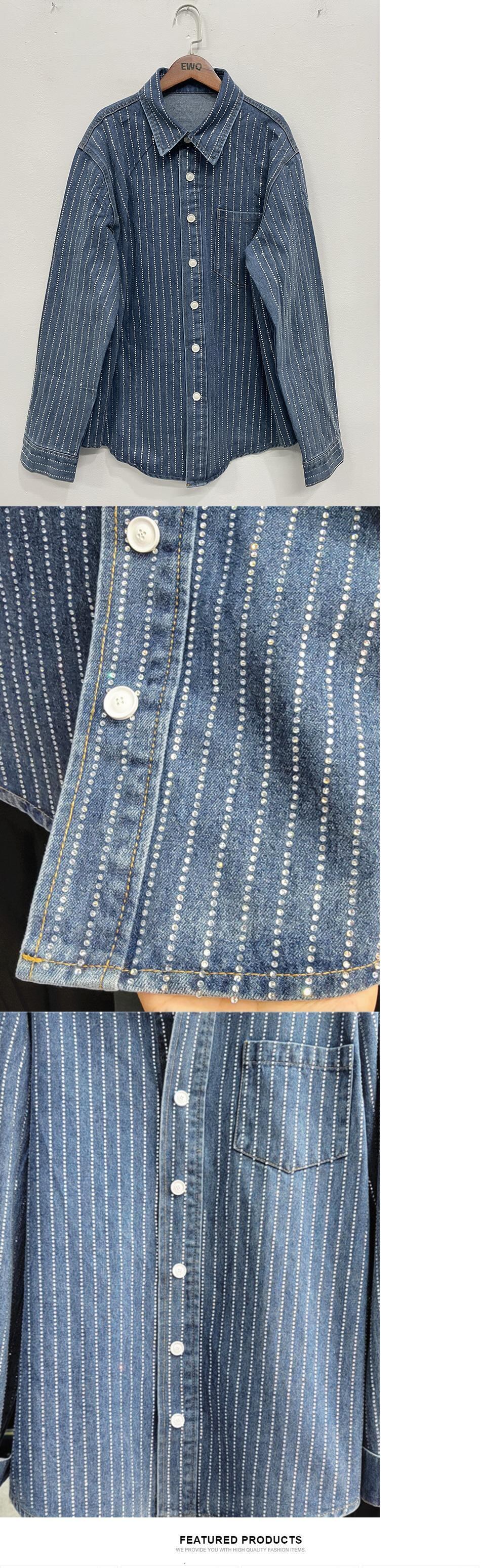 [EWQ] ブルーデニムラインストーンビッグサイズブラウス長袖ルーズフィットシャツコート潮秋春ルーズトップス ロング スプリング 春物 オータム 秋物
