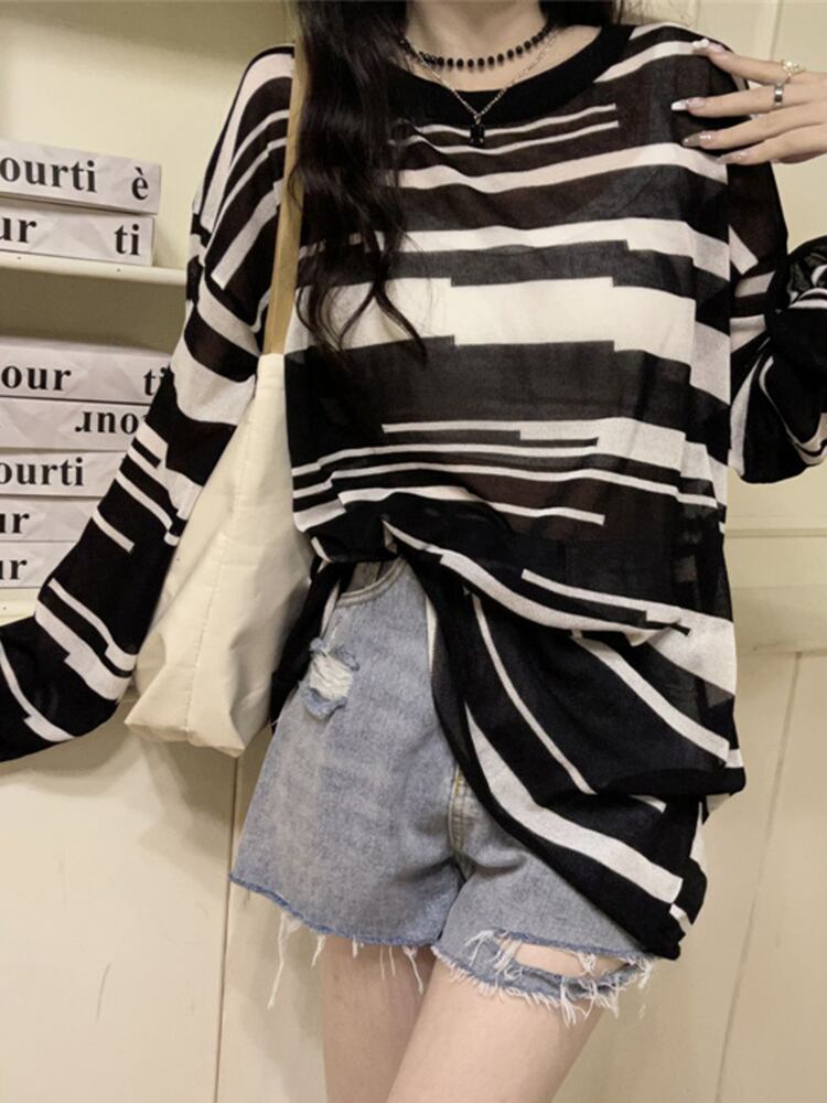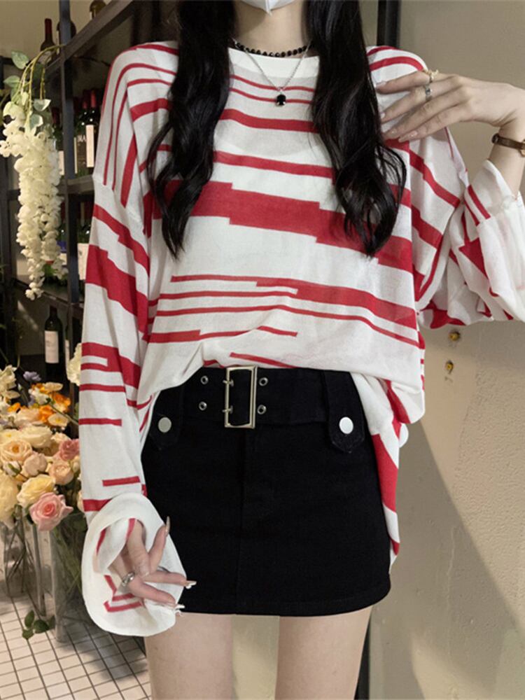 [EWQ] コントラストストライプニット Tシャツルーズ O ネックパッチワーク薄い秋ニットプルオーバートップス 6U773 オータム 秋物 Oネック