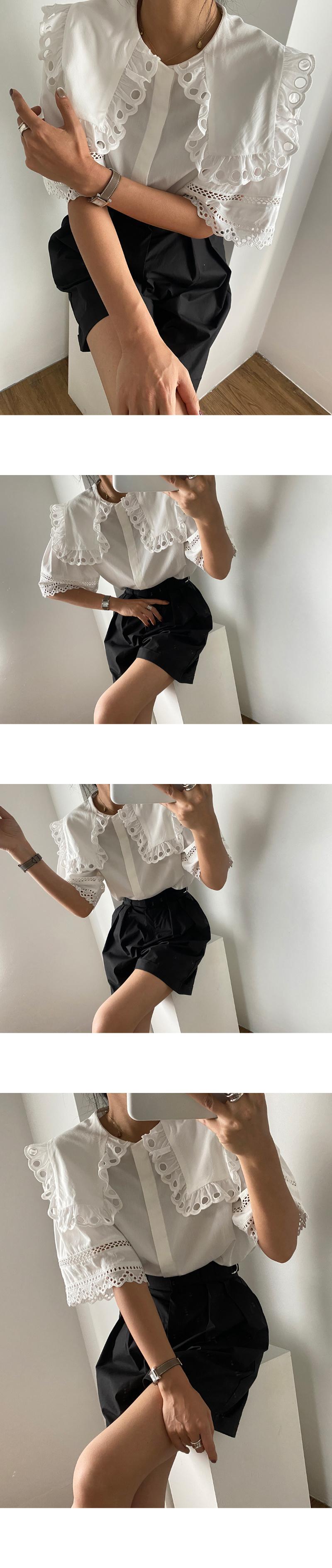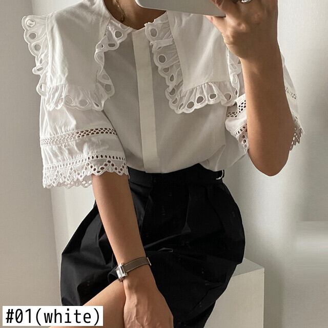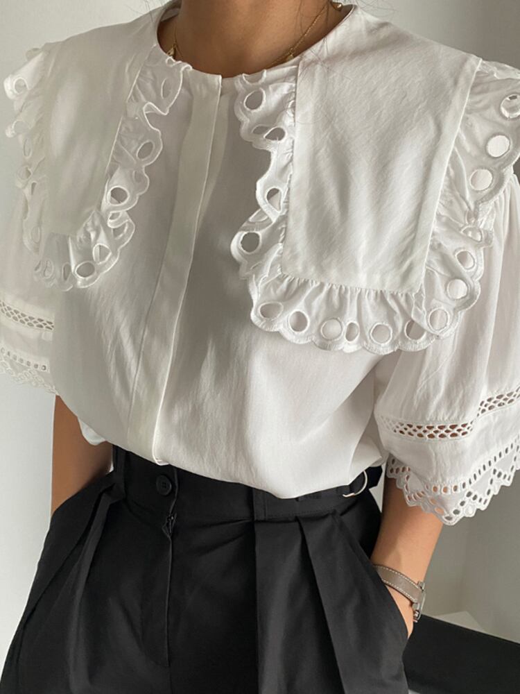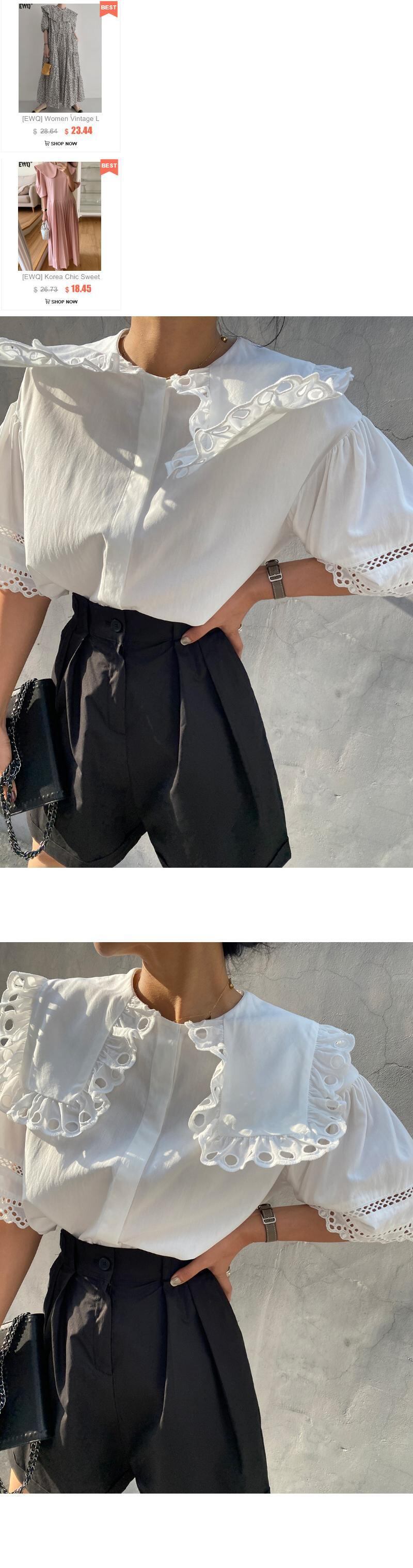 [EWQ] レディース フック フラワー ハーフスリーブ シャツ ホワイト ピーターパン カラー 中空アウト サマー タイド トップ 6U485 半袖 夏物 フラワーデザイン